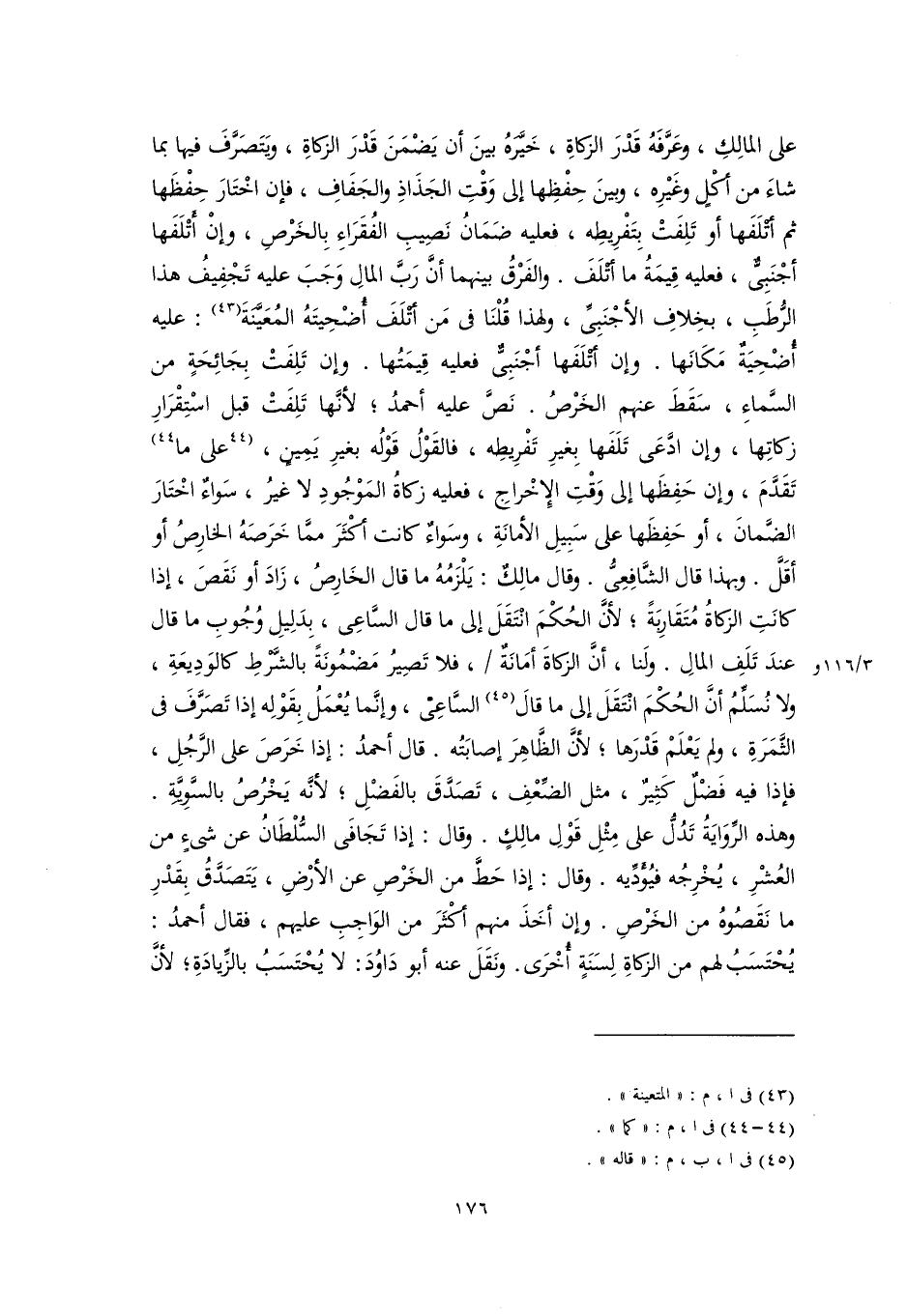 على المالِكِ، وعَرَّفَهُ قَدْرَ الزكاةِ، خَيَّرَهُ بينَ أن يَضْمَنَ قَدْرَ الزكاةِ، ويَتَصَرَّفَ فيها بما شاءَ من أكْلٍ وغَيْرِه، وبينَ حِفْظِها إلى وَقْتِ الجَذَاذِ والجَفَافِ، فإن اخْتَارَ حِفْظَها ثم أتْلَفَها أو تَلِفَتْ بِتَفْرِيطِه، فعليه ضَمَانُ نَصِيبِ الفُقَرَاءِ بِالخَرْصِ، وإنْ أتْلَفَها أجْنَبِيٌّ، فعليه قِيمَةُ ما أتْلَفَ. والفَرْقُ بينهما أنَّ رَبَّ المالِ وَجَبَ عليه تَجْفِيفُ هذا الرُّطَبِ، بخِلافِ الأجْنَبِيِّ، ولهذا قُلْنَا في مَن أتْلَفَ أُضْحِيتَهُ المُعَيَّنَةَ (٤٣): عليه أُضْحِيَةٌ مَكَانَها. وإن أتْلَفَها أجْنَبِيٌّ فعليه قِيمَتُها. وإن تَلِفَتْ بِجَائِحَةٍ من السَّماءِ، سَقَطَ عنهم الخَرْصُ. نَصَّ عليه أحمدُ؛ لأنَّها تَلِفَتْ قبل اسْتِقْرَارِ زكاتِها، وإن ادَّعَى تَلَفَها بِغيرِ تَفْرِيطِه، فالقَوْلُ قَوْلُه بغيرِ يَمِينٍ، [على ما] (٤٤) تَقَدَّمَ، وإن حَفِظَها إلى وَقْتِ الإخْراجِ، فعليه زكاةُ المَوْجُودِ لا غيرُ، سَواءٌ اخْتَارَ الضَّمانَ، أو حَفِظَها على سَبِيلِ الأمانَةِ، وسَواءٌ كانت أكْثَرَ ممَّا خَرَصَهُ الخارِصُ أو أقَلَّ. وبهذا قال الشَّافِعِيُّ. وقال مالِكٌ: يَلْزَمُهُ ما قال الخَارِصُ، زَادَ أو نَقَصَ، إذا كانَتِ الزكاةُ مُتَقَارِبَةً؛ لأنَّ الحُكْمَ انْتَقَلَ إلى ما قال السَّاعِي، بِدَلِيلِ وُجُوبِ ما قال عندَ تَلَفِ المالِ. ولَنا، أنَّ الزكاةَ أمَانَةٌ، فلا تَصِيرُ مَضْمُونَةٌ بالشَّرْطِ كالوَدِيعَةِ، ولا نُسَلِّمُ أنَّ الحُكْمَ انْتَقَلَ إلى ما قالَ (٤٥) السَّاعِي، وإنَّما يُعْمَلُ بِقَوْلِه إذا تَصَرَّفَ في الثَّمَرَةِ، ولم يَعْلَمْ قَدْرَها؛ لأنَّ الظَّاهِرَ إصابَتُه. قال أحمدُ: إذا خَرَصَ على الرَّجُلِ، فإذا فيه فَضْلٌ كَثِيرٌ، مثل الضَّعْفِ، تَصَدَّقَ بالفَضْلِ؛ لأنَّه يَخْرُصُ بالسَّوِيَّةِ. وهذه الرِّوَايَةُ تَدُلُّ على مِثْلِ قَوْلِ مالِكٍ. وقال: إذا تَجَافَى السُّلْطَانُ عن شيْءٍ من العُشْرِ، يُخْرِجُه فيُؤَدِّيه. وقال: إذا حَطَّ من الخَرْصِ عن الأرْضِ، يَتَصَدَّقُ بِقَدْرِ ما نَقَصُوهُ من الخَرْصِ. وإن أخَذَ منهم أكْثَرَ من الوَاجِبِ عليهم، فقال أحمدُ: يُحْتَسَبُ لهم من الزكاةِ لِسَنَةٍ أُخْرَى. ونَقَلَ عنه أبو دَاوُدَ: لا يُحْتَسَبُ بالزِّيادَةِ، لأنَّ