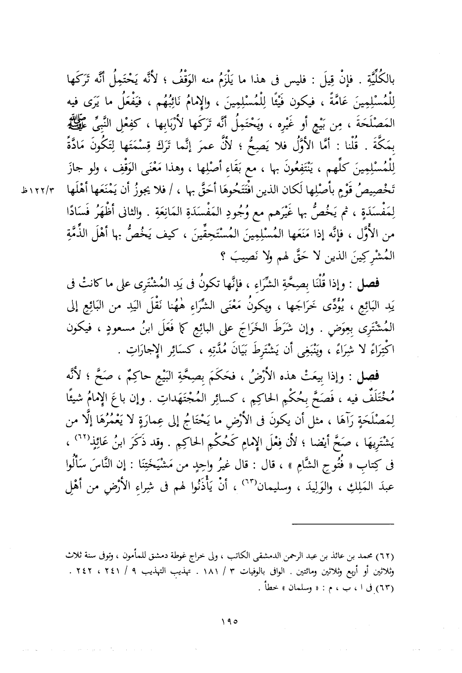 بالكُلِّيَّةِ. فإنْ قِيلَ: فليس في هذا ما يَلْزَمُ منه الوَقْفُ؛ لأنَّه يَحْتَمِلُ أنَّه تَرَكَها لِلْمُسْلِمِينَ عَامَّةً، فيكون فَيْئًا لِلْمُسْلِمِينَ، والإِمامُ نَائِبُهُم، فيَفْعَلُ ما يَرَى فيه المَصْلَحَةَ، مِن بَيْعٍ أو غَيْرِه، ويَحْتَمِلُ أنَّه تَرَكَها لأرْبَابِها، كفِعْلِ النَّبِيِّ -صَلَّى اللهُ عَلَيْه وَسَلَّمَ- بِمَكَّةَ. قُلْنا: أمَّا الأوَّلُ فلا يَصِحُّ؛ لأنَّ عمرَ إنَّما تَرَكَ قِسْمَتَها لِتَكُونَ مَادَّةً لِلْمُسْلِمِينَ كلِّهم، يَنْتَفِعُونَ بها، مع بَقَاءِ أصْلِها، وهذا مَعْنَى الوَقْفِ، ولو جازَ تَخْصِيصُ قَوْمٍ بأصْلِها لَكان الذين افْتَتَحُوهَا أحَقَّ بها، فلا يجوزُ أن يَمْنَعَها أهْلَها لِمَفسَدَةٍ، ثم يَخُصُّ بها غَيْرَهم مع وُجُودِ المَفْسَدَةِ المَانِعَةِ. والثاني أظْهَرُ فَسَادًا من الأَوَّل، فإنَّه إذا مَنَعَها المُسْلِمِينَ المُسْتَحِقِّينَ، كيف يَخُصُّ بها أهْلَ الذِّمَّةِ المُشْرِكِينَ الذين لا حَقَّ لهم ولا نَصِيبَ؟