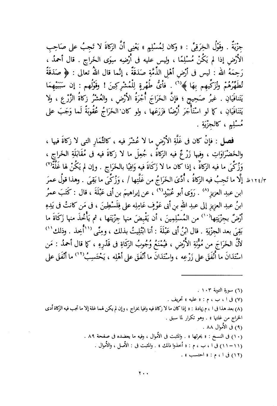 (٨) بعد هذا في ا، م زيادة: "إذا كان ما لا زكاة فيه وافيا بخراج، وإن لم يكن لهما غلة إلا ما تجب فيه الزكاة أدى الخراج من غلتها". وهو تكرار لما سبق.