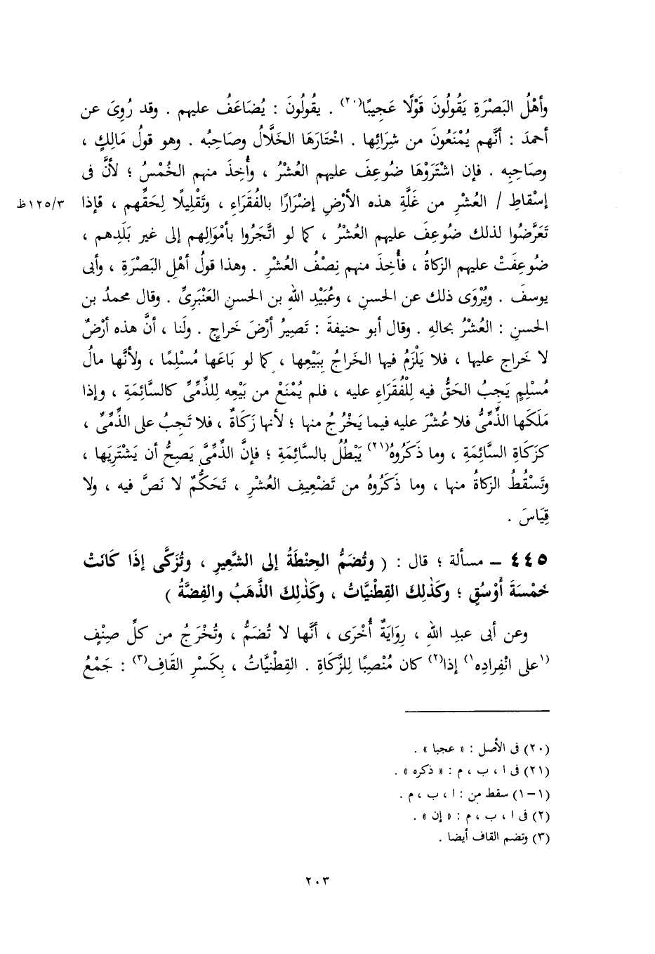 وأهْلُ البَصْرَةِ يَقُولُونَ قَوْلًا عَجِيبًا (٢٠). يقُولُونَ: يُضَاعَفُ عليهم. وقد رُوِىَ عن أحمدَ: أنَّهم يُمْنَعُونَ من شِرَائِها. اخْتَارَهَا الخَلَّالُ وصَاحِبُه. وهو قولُ مَالِكٍ، وصَاحِبِه. فإن اشْتَرَوْهَا ضُوعِفَ عليهم العُشْرُ، وأُخِذَ منهم الخُمْسُ؛ لأنَّ في إسْقاطِ العُشْرِ من غَلَّةِ هذه الأرْضِ إضْرَارًا بالفُقَرَاءِ، وتَقْلِيلًا لِحَقِّهم، فإذا تَعَرَّضُوا لذلك ضُوعِفَ عليهم العُشْرُ، كما لو اتَّجَرُوا بأمْوَالِهم إلى غير بَلَدِهم، ضُوعِفَتْ عليهم الزكاةُ، فأُخِذَ منهم نِصْفُ العُشْرِ. وهذا قولُ أهْلِ البَصْرَةِ، وأبى يوسفَ. ويُرْوَى ذلك عن الحسنِ، وعُبَيْدِ اللهِ بن الحسنِ العَنْبَرِيِّ. وقال محمدُ بن الحسنِ: العُشْرُ بحالهِ. وقال أبو حنيفةَ: تَصِيرُ أرْضَ خَراجٍ. ولَنا، أنَّ هذه أرْضٌ لا خَراج عليها، فلا يَلْزَمُ فيها الخَراحُ بِبَيْعِها، كما لو بَاعَها مُسْلِمًا، ولأنَّها مالُ مُسْلِمٍ يَجِبُ الحَقُّ فيه لِلْفُقَرَاءِ عليه، فلم يُمْنَعْ من بَيْعِه لِلذِّمِّيِّ كالسَّائِمَةِ، وإذا مَلَكَها الذِّمِّيُّ فلا عُشْرَ عليه فيما يَخْرُجُ منها؛ لأنها زَكَاةٌ، فلا تَجِبُ على الذِّمِّيِّ، كزَكَاةِ السَّائِمَةِ، وما ذَكَرُوهُ (٢١) يَبْطُلُ بالسَّائِمَةِ؛ فإنَّ الذِّمِّيَّ يَصِحُّ أن يَشْتَرِيَها، وتَسْقُطُ الزكاةُ منها، وما ذَكَرُوهُ من تَضْعِيفِ العُشْرِ، تَحَكُّمٌ لا نَصَّ فيه، ولا قِيَاسَ.