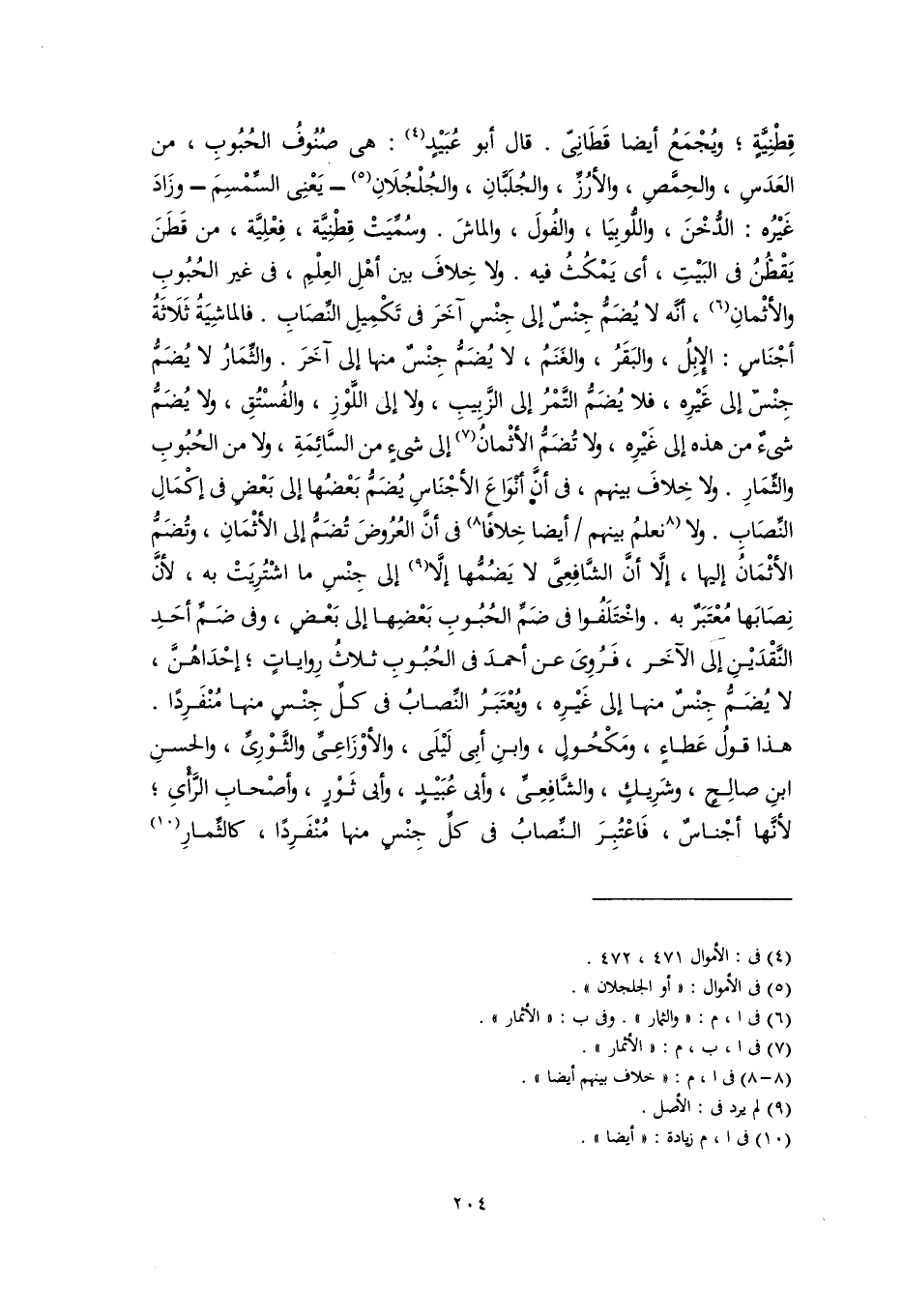 قِطْنِيَّةٍ؛ ويُجْمَعُ أيضا قَطَانِيّ. قال أبو عُبَيْدٍ (٤): هى صُنُوفُ الحُبُوبِ، من العَدَسِ، والحِمَّصِ، والأرُزِّ، والجُلَبَّانِ، والجُلْجُلَانِ (٥) -يَعْنِى السِّمْسِمَ- وزَادَ غَيْرُه: الدُّخْنَ، واللُّوبِيَا، والفُولَ، والماشَ. وسُمِّيَتْ قِطْنِيَّة، فِعْلِيَّة، من قَطنَ يَقْطُنُ في البَيْتِ، أى يَمْكُثُ فيه. ولا خِلافَ بين أهْلِ العِلْمِ، في غير الحُبُوبِ والأثْمانِ (٦)، أنَّه لا يُضَمُّ جِنْسٌ إلى جِنْسٍ آخَرَ في تَكْمِيلِ النِّصَابِ. فالماشِيَةُ ثَلَاثَةُ أجْنَاسٍ: الإِبِلُ، والبَقَرُ، والغَنَمُ، لا يُضَمُّ جِنْسٌ منها إلى آخَرَ. والثِّمَارُ لا يُضَمُّ جِنْسٌ إلى غَيْرِه، فلا يُضَمُّ التَّمْرُ إلى الزَّبِيبِ، ولا إلى اللَّوْزِ، والفُسْتُقِ، ولا يُضَمُّ شىءٌ من هذه إلى غَيْرِه، ولا تُضَمُّ الأثْمانُ (٧) إلى شىءٍ من السَّائِمَةِ، ولا من الحُبُوبِ والثِّمَارِ. ولا خِلافَ بينهم، في أنَّ أنْوَاعَ الأجْنَاسِ يُضَمُّ بَعْضُها إلى بَعْضٍ في إكْمَالِ النِّصَابِ. ولا [نعلمُ بينهم أيضا خِلافًا] (٨) في أنَّ العُرُوضَ تُضَمُّ إلى الأثْمَانِ، وتُضَمُّ الأثْمَانُ إليها، إلَّا أنَّ الشَّافِعِيَّ لا يَضُمُّها إلَّا (٩) إلى جِنْسِ ما اشْتُرِيَتْ به، لأنَّ نِصَابَها مُعْتَبَرٌ به. واخْتَلَفُوا في ضَمِّ الحُبُوبِ بَعْضِها إلى بَعْضٍ، وفى ضَمِّ أحَدِ النَّقْدَيْنِ إلى الآخَر، فَرُوِىَ عن أحمدَ في الحُبُوبِ ثلاثُ رِواياتٍ؛ إحْدَاهُنَّ، لا يُضَمُّ جِنْسٌ منها إلى غَيْرِه، ويُعْتَبَرُ النِّصابُ في كلِّ جِنْسٍ منها مُنْفَرِدًا. هذا قولُ عَطاءٍ، ومَكْحُولٍ، وابنِ أبِى لَيْلَى، والأوْزَاعِيِّ والثَّوْرِيِّ، والحسنِ ابنِ صالِحٍ، وشَرِيكٍ، والشَّافِعِيِّ، وأبي عُبَيْدٍ، وأبي ثَوْرٍ، وأصْحابِ الرَّأْىِ؛ لأنَّها أجْناسٌ، فَاعْتُبِرَ النِّصابُ في كلِّ جِنْسٍ منها مُنْفَرِدًا، كالثِّمارِ (١٠)