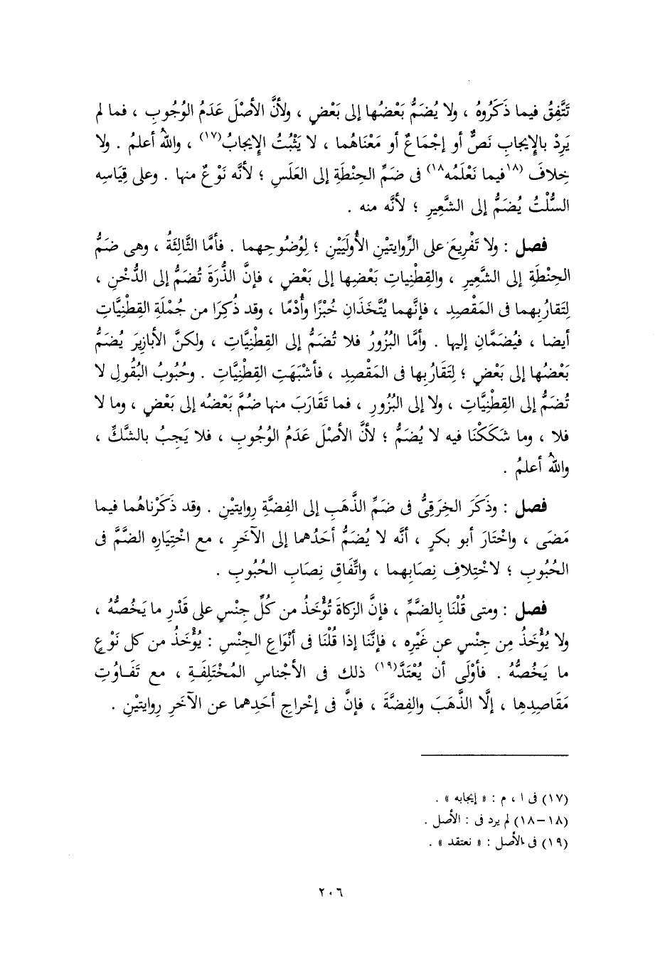 فصل: ولا تَفْرِيعَ على الرِّوايتيْنِ الأُولَيَيْنِ؛ لِوُضُوحِهما. فأمَّا الثَّالِثَةُ، وهى ضَمُّ الحِنْطَةِ إلى الشَّعِيرِ، والقِطْنِياتِ بَعْضِها إلى بَعْضٍ، فإنَّ الذُّرَةَ تُضَمُّ إلى الدُّخْنِ، لِتَقارُبِهما في المَقْصِدِ، فإنَّهما يُتَّخَذَانِ خُبْزًا وأُدْمًا، وقد ذُكِرَا من جُمْلَةِ القِطْنِيَّاتِ أيضا، فيُضَمَّانِ إليها. وأمَّا البُزُورُ فلا تُضَمُّ إلى القِطْنِيَّاتِ، ولكنَّ الأبازِيرَ يُضَمُّ بَعْضُها إلى بَعْضٍ؛ لِتَقَارُبِها في المَقْصِدِ، فأشْبَهَتِ القِطْنِيَّاتِ. وحُبُوبُ البُقُولِ لا تُضَمُّ إلى القِطْنِيَّاتِ، ولا إلى البُزُورِ، فما تَقَارَبَ منها ضُمَّ بَعْضُه إلى بَعْضٍ، وما لا فلا، وما شَكَكْنَا فيه لا يُضَمُّ؛ لأنَّ الأصْلَ عَدَمُ الوُجُوبِ، فلا يَجِبُ بالشَّكِّ، واللهُ أعلمُ.