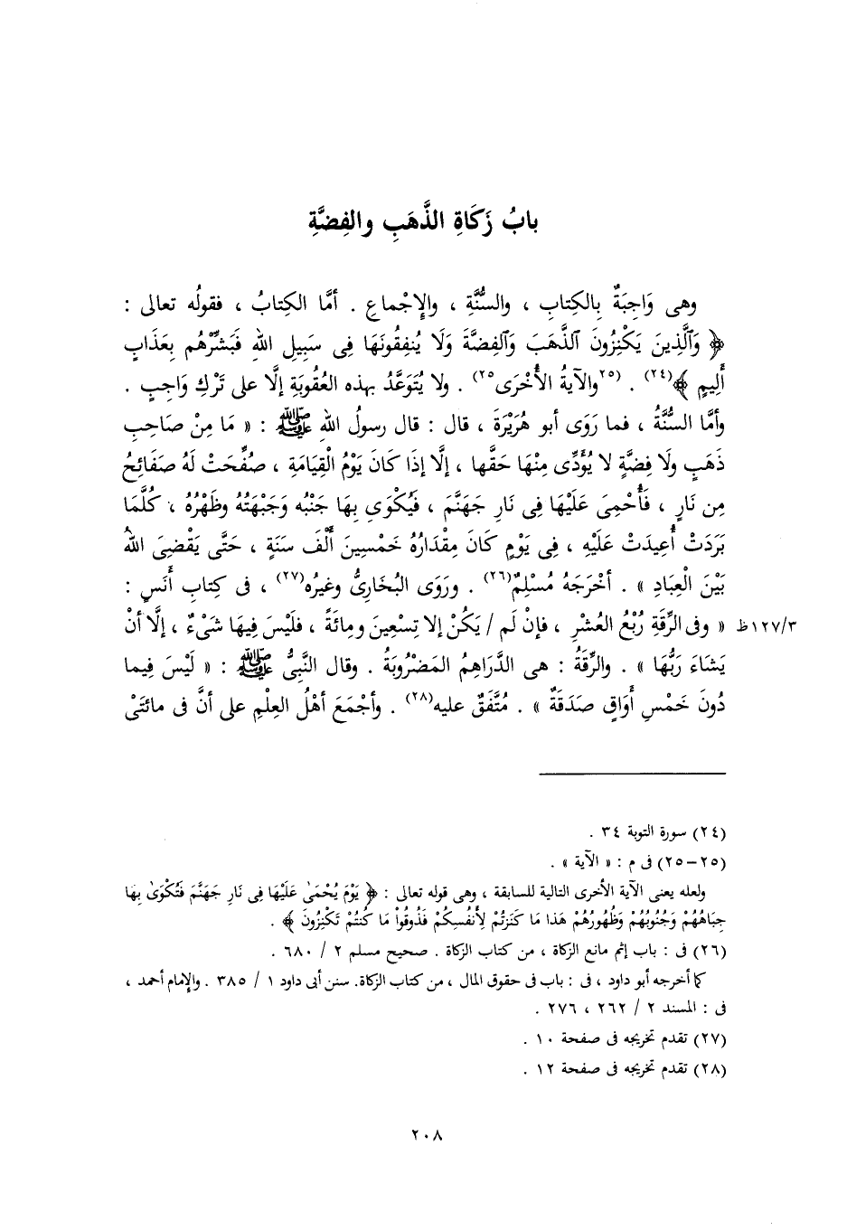 وهى وَاجِبَةٌ بِالكِتابِ، والسُّنَّةِ، والإِجْماعِ. أمَّا الكِتابُ، فقولُه تعالى: {وَالَّذِينَ يَكْنِزُونَ الذَّهَبَ وَالْفِضَّةَ وَلَا يُنْفِقُونَهَا فِي سَبِيلِ اللَّهِ فَبَشِّرْهُمْ بِعَذَابٍ أَلِيمٍ} (٢٤). [والآيةُ الأُخْرَى] (٢٥). ولا يُتَوَعَّدُ بهذه العُقُوبَةِ إلَّا على تَرْكِ وَاجِبٍ. وأمَّا السُّنَّةُ، فما رَوَى أبو هُرَيْرَةَ، قال: قال رسولُ اللهِ -صَلَّى اللهُ عَلَيْهِ وَسَلَّمَ-: "مَا مِنْ صَاحِبِ ذَهَبٍ ولَا فِضَّةٍ لا يُؤَدِّى مِنْهَا حَقَّها، إلَّا إذَا كَانَ يَوْمُ الْقِيَامَةِ، صُفِّحَتْ لَهُ صَفَائِحُ مِن نَارٍ، فَأُحْمِىَ عَلَيْهَا فِى نَارِ جَهَنَّمَ، فَيُكْوَى بِهَا جَنْبُه وَجَبْهَتُهُ وظَهْرُهُ، كُلَّمَا بَرَدَتْ أُعِيدَتْ عَلَيْهِ، فِى يَوْمٍ كَانَ مِقْدَارُهُ خَمْسِينَ أَلْفَ سَنَةٍ، حَتَّى يَقْضِىَ اللهُ بَيْنَ الْعِبَادِ". أخْرَجَهُ مُسْلِمٌ (٢٦). ورَوَى البُخَارِيُّ وغيرُه (٢٧)، في كِتابِ أَنَسٍ: "وفى الرِّقَةِ رُبْعُ العُشْرِ، فإنْ لَم يَكُنْ إلا تِسْعِينَ ومِائَةً، فلَيْسَ فِيهَا شَيْءٌ، إلَّا أنْ يَشَاءَ رَبُّهَا". والرِّقَةُ: هى الدَّرَاهِمُ المَضْرُوبَةُ. وقال النَّبِيُّ -صَلَّى اللهُ عَلَيْهِ وَسَلَّمَ-: "لَيْسَ فِيما دُونَ خَمْسِ أَوَاقٍ صَدَقَةٌ". مُتَّفَقٌ عليه (٢٨). وأجْمَعَ أهْلُ العِلْمِ على أنَّ في مائتَىْ