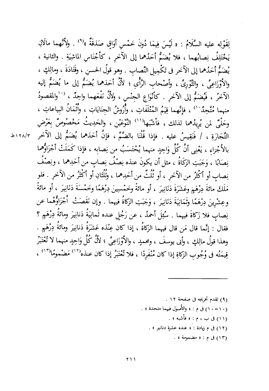 لِقَوْلِه عليه السَّلَامُ: "لَيْسَ فِيمَا دُونَ خَمْسِ أوَاقٍ صَدَقَةٌ" (٩). ولأنَّهما مالَانِ يَخْتَلِفُ نِصابُهما، فلا يُضَمُّ أحَدُهما إلى الآخَرِ، كأجْنَاسِ الماشِيَةِ. والثانية، يُضَمُّ أحَدُهما إلى الآخَر في تَكْمِيلِ النِّصابِ. وهو قولُ الحسنِ، وقَتَادَةَ، ومالِكٍ، والأوْزَاعِيِّ، والثَّوْرِيِّ، وأصْحابِ الرَّأْىِ؛ لأنَّ أحَدَهما يُضَمُّ إلى ما يُضَمُّ إليه الآخَرُ، فَيُضَمُّ إلى الآخَرِ. كأنْوَاعِ الجِنْسِ، ولأنَّ نَفْعَهما واحِدٌ، [والمقصودُ منهما مُتَّحِدٌ] (١٠)، فإنَّهما قِيَمُ المُتْلَفَاتِ، وأُرُوشُ الجِنَايَاتِ، وأَثْمَانُ البِياعاتِ، وحَلْيٌ لمن يُرِيدُهما لذلك، فأشْبَها (١١) النَّوْعَيْنِ، والحَدِيثُ مَخْصُوصٌ بِعَرْضِ التِّجَارَةِ، فَنَقِيسُ عليه. فإذا قُلْنَا بالضَّمِّ، فإنَّ أحَدَهما يُضَمُّ إلى الآخَر بالأجْزاءِ، يَعْنِى أنَّ كُلَّ وَاحِدٍ منهما يُحْتَسَبُ من نِصابِه، فإذا كَمَلَتْ أجْزَاؤُهما نِصَابًا، وَجَبَتِ الزكَاةُ، مثل أن يكونَ عندَه نِصْفُ نِصابٍ من أحَدِهما، ونِصْفُ نِصابٍ أو أكْثَرُ من الآخَرِ، أو ثُلُثٌ منٍ أحَدِهما، وثُلُثَانِ أو أكْثَرُ من الآخَرِ. فلو مَلَكَ مائةَ دِرْهَمٍ وعَشَرَةَ دَنَانِيرَ، أو مائةً وخَمْسِينَ دِرْهَمًا وخَمْسَةَ دَنَانِيرَ، أو مائةً وعِشْرِينَ دِرْهَمًا وثَمَانِيَةَ دَنَانِيرَ، وَجَبَتِ الزكاةُ فيهما. وإن نَقَصَتْ أَجْزَاؤُهُما عن نِصابٍ فلا زَكاةَ فيهما. سُئِلَ أحمدُ، عن رَجُلٍ عنده ثَمانِيَةُ دَنانِيرَ ومائةُ دِرْهَمٍ؟ فقال: إنَّما قال مَن قال فيهما الزكاةُ، إذا كان عِنْدَه عَشَرَةُ دَنانِيرَ ومائةُ دِرْهَمٍ. وهذا قولُ مالِكٍ، وأبى يوسفَ، ومحمدٍ، والأوْزَاعِيِّ؛ لأنَّ كُلَّ وَاحِدٍ منهما لا تُعْتَبَرُ قِيمَتُه في وُجُوبِ الزكاةِ إذا كان مُنْفَرِدًا، فلا تُعْتَبَرُ إذا كان عندَه (١٢) مَضْمومًا (١٣)،