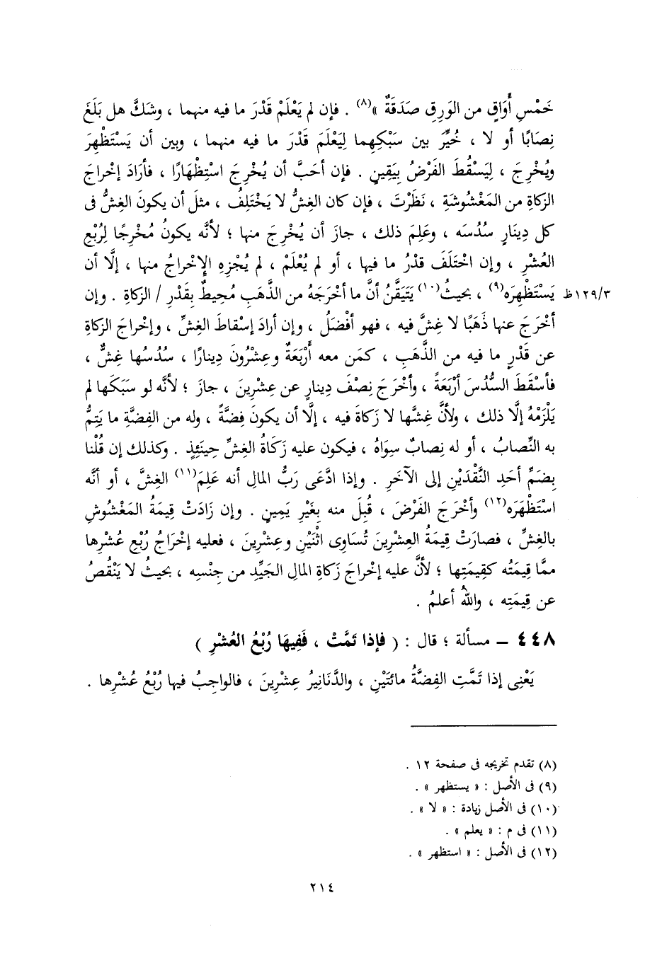 خَمْسِ أَوَاقٍ من الوَرِقِ صَدَقَةٌ" (٨). فإن لم يَعْلَمْ قَدْرَ ما فيه منهما، وشَكَّ هل بَلَغَ نِصَابًا أو لا، خُيِّرَ بين سَبْكِهِما لِيَعْلَمَ قَدْرَ ما فيه منهما، وبين أن يَسْتَظْهِرَ ويُخْرِجَ، لِيَسْقُطَ الفَرْضُ بِيَقِينٍ. فإن أحَبَّ أن يُخْرِجَ اسْتِظْهَارًا، فأرَادَ إخْراجَ الزكاةِ من المَغْشُوشَةِ، نَظَرْتَ، فإن كان الغِشُّ لا يَخْتَلِفُ، مثلَ أن يكونَ الغِشُّ في كل دِينَارٍ سُدُسَه، وعَلِمَ ذلك، جازَ أن يُخْرِجَ منها؛ لأنَّه يكونُ مُخْرِجًا لِرُبْعِ العُشْرِ، وإن اخْتَلَفَ قدْرُ ما فيها، أو لم يُعْلَمْ، لم يُجْزِهِ الإِخْراجُ منها، إلَّا أن يَسْتَظْهِرَه (٩)، بحيثُ (١٠) يَتَيَقَّنُ أنَّ ما أخْرَجَهُ من الذَّهَبِ مُحِيطٌ بِقَدْرِ الزكاةِ. وإن أخْرَجَ عنها ذهَبًا لا غِشَّ فيه، فهو أفْضَلُ، وإن أرادَ إسْقاطَ الغِشِّ، وإخْراجَ الزكاةِ عن قَدْرِ ما فيه من الذَّهَبِ، كمَن معه أَرْبَعَةٌ وعِشْرُونَ دِينارًا، سُدُسُها غِشٌّ، فأسْقَطَ السُّدُسَ أرْبَعَةً، وأخْرَجَ نِصْفَ دِينارٍ عن عِشْرِينَ، جازَ؛ لأنَّه لو سَبَكَها لم يَلْزَمْهُ إلَّا ذلك، ولأنَّ غِشَّها لا زَكاةَ فيه، إلَّا أن يكونَ فِضَّةً، وله من الفِضَّةِ ما يَتِمُّ به النِّصابُ، أو له نِصابٌ سِوَاهُ، فيكون عليه زَكَاةُ الغِشِّ حِينَئِذٍ. وكذلك إن قُلْنا بِضَمِّ أحَدِ النَّقْدَيْنِ إلى الآخَرِ. وإذا ادَّعَى رَبُّ المالِ أنه عَلِمَ (١١) الغِشَّ، أو أنَّه اسْتَظْهَرَه (١٢) وأخْرَجَ الفَرْضَ، قُبِلَ منه بِغَيْرِ يَمِينٍ. وإن زَادَتْ قِيمَةُ المَغْشُوشِ بالغِشِّ، فصارَتْ قِيمَةُ العِشْرِينَ تُسَاوِى اثْنَيْنِ وعِشْرِينَ، فعليه إخْرَاجُ رُبْعِ عُشْرِها ممَّا قِيمَتُه كقِيمَتِها؛ لأنَّ عليه إخْراجَ زَكاةِ المالِ الجَيِّدِ من جِنْسِه، بحيثُ لا يَنْقُصُ عن قِيمَتِه، واللهُ أعلمُ.