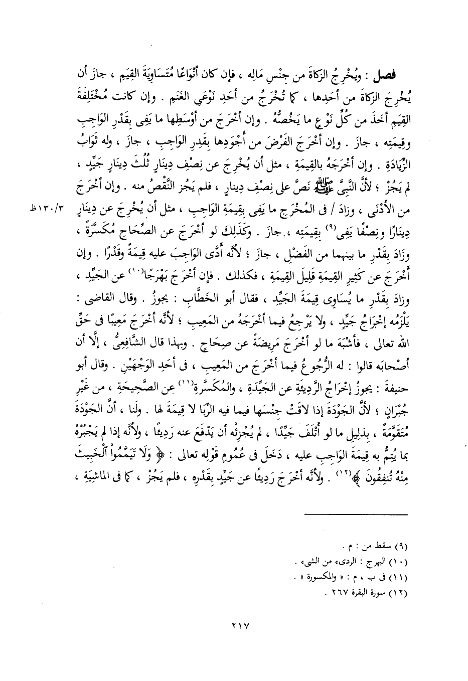 فصل: ويُخْرِجُ الزكاةَ من جِنْسِ مَالِه، فإن كان أنْوَاعًا مُتَسَاوِيَةَ القِيَمِ، جازَ أن يُخْرِجَ الزكاةَ من أحَدِها، كما تُخْرَجُ من أحَدِ نَوْعَىِ الغَنَمِ. وإن كانت مُخْتَلِفَةَ القِيَمِ أخَذَ من كُلِّ نَوْعٍ ما يَخُصُّهُ. وإن أخْرَجَ من أوْسَطِها ما يَفِى بِقَدْرِ الوَاجِبِ وقِيمَتِه، جازَ. وإن أخْرَجَ الفَرْضَ من أَجْوَدِها بِقَدرِ الوَاجِبِ، جازَ، وله ثَوَابُ الزِّيَادَةِ. وإن أخْرَجَهُ بالقِيمَةِ، مثل أن يُخْرِجَ عن نِصْفِ دِينَارٍ ثُلُثَ دِينَارٍ جَيِّدٍ، لم يَجُزْ؛ لأنَّ النَّبِيَّ -صَلَّى اللهُ عَلَيْهِ وَسَلَّمَ- نَصَّ على نِصْفِ دِينارٍ، فلم يَجُز النَّقْصُ منه. وإن أخْرَجَ من الأدْنَى، وزادَ في المُخْرَجِ ما يَفِى بِقِيمَةِ الوَاجِبِ، مثل أن يُخْرِجَ عن دِينَارٍ دِينَارًا ونِصْفًا يَفِى (٩) بِقِيمَتِه، جازَ. وكَذَلِكَ لو أَخْرَجَ عن الصِّحَاحِ مُكَسَّرَةً، وزَادَ بِقَدْرِ ما بينهما من الفَضْلِ، جازَ؛ لأنَّه أدَّى الوَاجِبَ عليه قِيمَةً وقَدْرًا. وإن أَخْرَجَ عن كَثِيرِ القِيمَةِ قَلِيلَ القِيمَةِ، فكذلك. فإن أخْرَجَ بَهْرَجًا (١٠) عن الجَيِّدِ، وزادَ بِقَدْرِ ما يُسَاوِى قِيمَةَ الجَيِّدِ، فقال أبو الخَطَّابِ: يجوزُ. وقال القاضى: يَلْزَمُه إخْرَاجُ جَيِّدٍ، ولا يَرْجِعُ فيما أخْرَجَهُ من المَعِيبِ؛ لأنَّه أخْرَجَ مَعِيبًا في حَقِّ اللَّه تعالى، فأشْبَهَ ما لو أخْرَجَ مَرِيضَةً عن صِحَاحٍ. وبهذا قال الشَّافِعِيُّ، إلَّا أن أصْحابَه قالوا: له الرُّجُوعُ فيما أخْرَجَ من المَعِيبِ، في أحَدِ الوَجْهَيْنِ. وقال أبو حنيفةَ: يجوزُ إخْرَاجُ الرَّدِيئَةِ عن الجَيِّدَةِ، والمُكَسَّرةِ (١١) عن الصَّحِيحَةِ، من غَيْرِ جُبْرَانٍ؛ لأنَّ الجَوْدَةَ إذا لاقَتْ جِنْسَها فيما فيه الرِّبَا لا قِيمَةَ لها. ولَنا، أنَّ الجَوْدَةَ مُتَقَوَّمَةٌ، بِدَلِيلِ ما لو أَتْلَفَ جَيِّدًا، لم يُجْزِئْه أن يَدْفَعَ عنه رَدِيئًا، ولأنَّه إذا لم يَجْبُرْهُ بما يُتِمُّ به قِيمَةَ الوَاجِبِ عليه، دَخَلَ في عُمُومِ قَوْلِه تعالى: {وَلَا تَيَمَّمُوا الْخَبِيثَ مِنْهُ تُنْفِقُونَ} (١٢). ولأنَّه أخْرَجَ رَدِيئًا عن جَيِّدٍ بِقَدْرِه، فلم يَجُزْ، كما في الماشِيَةِ،