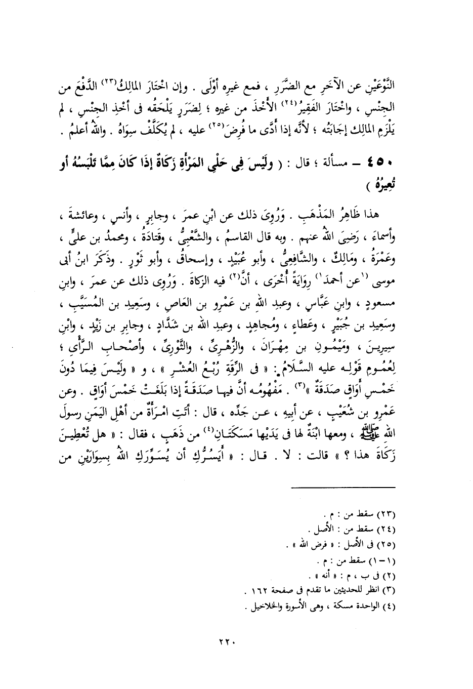 هذا ظَاهِرُ المَذْهَبِ. وَرُوِىَ ذلك عن ابْنِ عمرَ، وجابِرٍ، وأنسٍ، وعائشةَ، وأسماءَ، رَضِىَ اللهُ عنهم. وبه قال القاسمُ، والشَّعْبِيُّ، وقَتادَةُ، ومحمدُ بن عليٍّ، وعَمْرَةُ، ومَالِكٌ، والشَّافِعِيُّ، وأبو عُبَيْدٍ، وإسحاقُ، وأبو ثَوْرٍ. وذَكَرَ ابنُ أبي موسى [عن أحمدَ] (١) رِوَايَةً أُخْرَى، أنَّ (٢) فيه الزكاةَ. وَرُوِى ذلك عن عمرَ، وابنِ مسعودٍ، وابنِ عَبَّاسٍ، وعبدِ اللهِ بن عَمْرِو بن العَاصِ، وسَعِيدِ بن المُسَيَّبِ، وسَعِيدِ بن جُبَيْرٍ، وعَطاءٍ، ومُجاهِدٍ، وعبدِ اللَّه بن شَدَّادٍ، وجابِرِ بن زَيْدٍ، وابْنِ سِيرِينَ، ومَيْمُونِ بن مِهْرَانَ، والزُّهْرِيِّ، والثَّوْرِيِّ، وأصْحابِ الرَّأْىِ؛ لِعُمُومِ قَوْلِه عليه السَّلَامُ: "في الرِّقَةِ رُبْعُ العُشْرِ"، و "ولَيْسَ فِيمَا دُونَ خَمْسِ أَوَاقٍ صَدَقَةٌ" (٣). مَفْهُومُه أنَّ فيها صَدَقَةً إذا بَلَغَتْ خَمْسَ أوَاقٍ. وعن عَمْرِو بن شُعَيْبٍ، عن أبِيهِ، عن جَدِّه، قال: أتَتِ امْرَأَةٌ من أهْلِ اليَمَنِ رسولَ اللهِ -صَلَّى اللهُ عَلَيْهِ وَسَلَّمَ-، ومعها ابْنَةٌ لها في يَدَيْها مَسَكَتَانِ (٤) من ذَهَبٍ، فقال: "هل تُعْطِينَ زَكَاةَ هذا؟ " قالت: لا. قال: "أَيَسُرُّكِ أن يُسَوِّرَكِ اللهُ بِسِوَارَيْنِ من