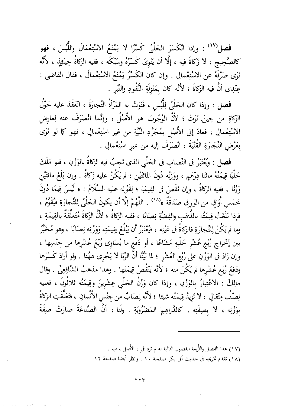 فصل (١٧): وإذا انْكَسَرَ الحَلْىُ كَسْرًا لا يَمْنَعُ الاسْتِعْمَالَ واللُّبْسَ، فهو كالصَّحِيحِ، لا زَكاةَ فيه، إلَّا أن يَنْوِىَ كَسْرَهُ وسَبْكَه، ففيه الزكاةُ حِينَئِذٍ، لأنَّه نَوَى صَرْفَهُ عن الاسْتِعْمالِ. وإن كان الكَسْرُ يَمْنَعُ الاسْتِعْمالَ، فقال القاضى: عِنْدِى أنَّ فيه الزكاةَ؛ لأنَّه كان بِمَنْزِلَةِ النُّقُودِ والتِّبْرِ.