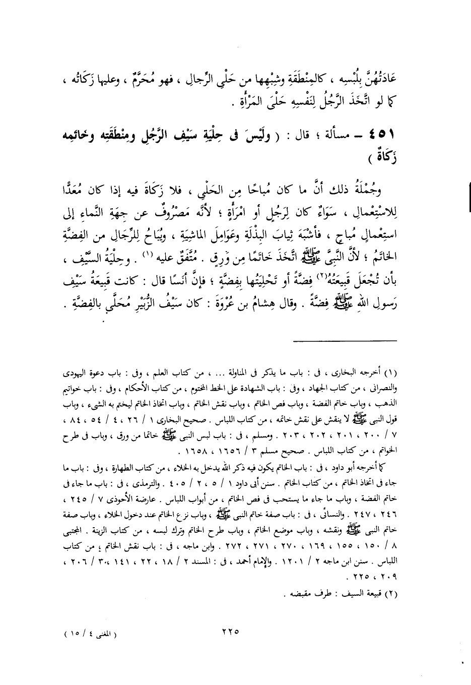 وجُمْلَةُ ذلك أنَّ ما كان مُباحًا مِن الحَلْىِ، فلا زَكَاةَ فيه إذا كان مُعَدًّا لِلاسْتِعْمالِ، سَوَاءٌ كان لِرَجُلٍ أو امْرَأَةٍ؛ لأنَّه مَصْرُوفٌ عن جِهَةِ النَّماءِ إلى استِعْمالٍ مُباحٍ، فأشْبَهَ ثِيابَ البِذْلَةِ وعَوَامِلَ الماشِيَةِ، ويُبَاحُ لِلرِّجَالِ من الفِضَّةِ الخاتَمُ، لأنَّ النَّبِيَّ -صَلَّى اللهُ عَلَيْهِ وَسَلَّمَ- اتَّخَذَ خَاتَمًا. مِن وَرِقٍ. مُتَّفَقٌ عليه (١). وحِلْيَةُ السَّيْفِ، بأن تُجْعَلَ قَبيعَتُهُ (٢) فِضَّةً أو تَحْلِيَتُها بِفِضَّةٍ؛ فإنَّ أنَسًا قال: كانت قَبِيعَةُ سَيْفِ رَسولِ اللهِ -صَلَّى اللهُ عَلَيْهِ وَسَلَّمَ- فِضَّةً. وقال هِشامُ بن عُرْوَةَ: كان سَيْفُ الزُّبَيْرِ مُحَلَّي بالفِضَّةِ.