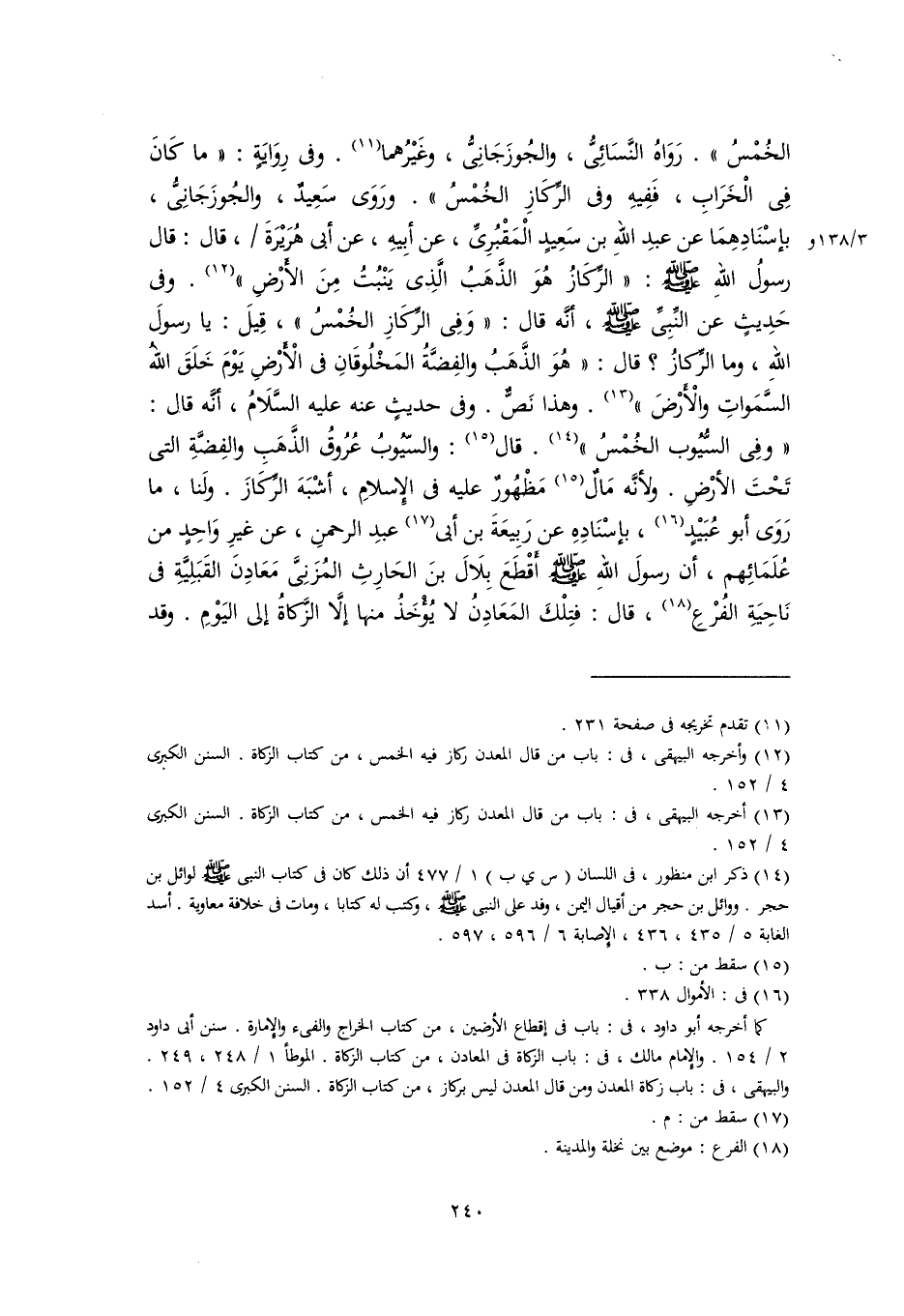 (١٣) أخرجه البيهقى، في: باب من قال المعدن ركاز فيه الخمس، من كتاب الزكاة. السنن الكبرى ٤/ ١٥٢.