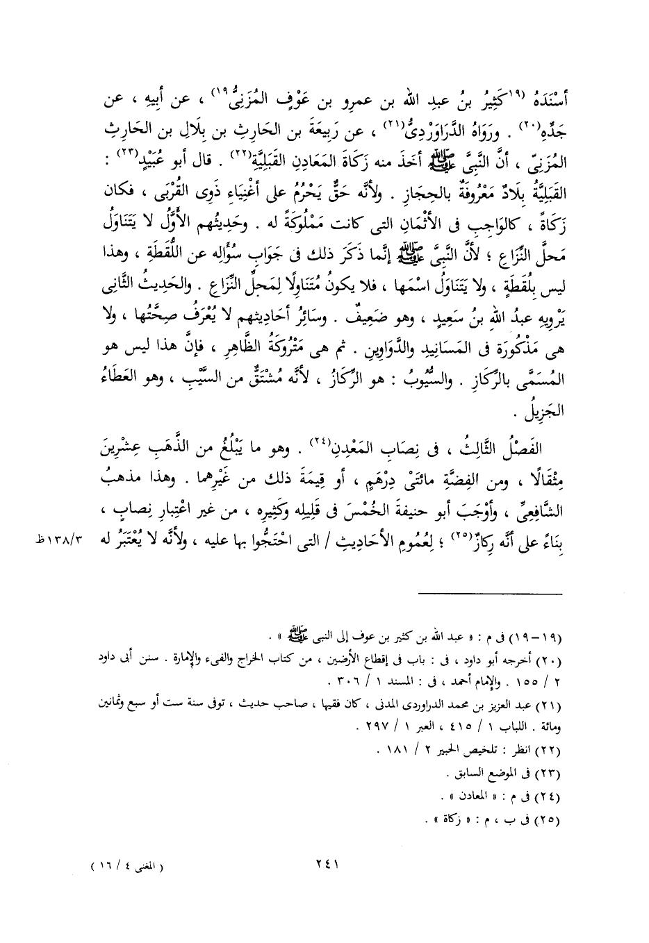 أسْنَدَهُ [كَثِيرُ بنُ عبدِ اللَّه بن عمرِو بن عَوْفٍ المُزَنِىُّ] (١٩)، عن أبِيهِ، عن جَدِّهِ (٢٠). ورَوَاهُ الدَّرَاوَرْدِىُّ (٢١)، عن رَبِيعَةَ بن الحَارِثِ بن بِلَالِ بن الحَارِثِ المُزَنِىّ، أنَّ النَّبِىَّ -صَلَّى اللهُ عَلَيْهِ وَسَلَّمَ- أخَذَ منه زَكَاةَ المَعَادِنِ القَبَلِيَّةِ (٢٢). قال أبو عُبَيْدٍ (٢٣): القَبَلِيَّةُ بِلَادٌ مَعْرُوفَةٌ بالحِجَازِ. ولأنَّه حَقٌّ يَحْرُمُ على أغْنِيَاءِ ذَوِى القُرْبَى، فكان زَكَاةً، كالوَاجِبِ في الأثْمَانِ التى كانت مَمْلُوكَةً له. وحَدِيثُهم الأوَّلُ لا يَتَنَاوَلُ مَحلَّ النِّزاعِ؛ لأنَّ النَّبِىَّ -صَلَّى اللهُ عَلَيْهِ وَسَلَّمَ- إنَّما ذَكَرَ ذلك فى جَوَابِ سُؤَالِه عن اللُّقَطَةِ، وهذا ليس بِلُقَطَةٍ، ولا يَتَنَاوَلُ اسْمَها، فلا يكونُ مُتَنَاوِلًا لِمَحِلِّ النِّزَاعِ. والحَدِيثُ الثَّانِى يَرْوِيهِ عبدُ اللهِ بنُ سَعِيدٍ، وهو ضَعِيفٌ. وسَائِرُ أحَادِيثهم لا يُعْرَفُ صِحَّتُها، ولا هى مَذْكُورَة في المَسَانِيدِ والدَّوَاوِينِ. ثم هى مَتْرُوكَةُ الظَّاهِرِ، فإنَّ هذا ليس هو المُسَمَّى بالرِّكَازِ. والسُّيُوبُ: هو الرِّكَازُ، لأنَّه مُشْتَقٌّ من السَّيْبِ، وهو العَطَاءُ الجَزِيلُ.