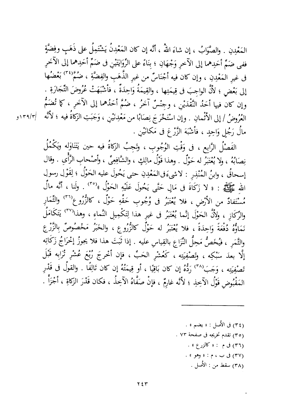 الفَصْلُ الرَّابِع، في وَقْتِ الوُجُوبِ، وتجِبُ الزكاةُ فيه حين يَتَنَاوَله ويَكْمُلُ نِصَابُهُ، ولا يُعْتَبَرُ له حَوْلٌ. وهذا قَوْلُ مالِكٍ، والشَّافِعِىِّ، وأصْحابِ الرَّأْىِ. وقال إسحاقُ، وابنُ المُنْذِرِ: لا شىءَ فى المَعْدِنِ حتى يَحُولَ عليه الحَوْلُ؛ لِقَوْلِ رسولِ اللهِ -صَلَّى اللهُ عَلَيْهِ وَسَلَّمَ-: "لا زَكَاةَ في مَالٍ حَتَّى يَحُولَ عَلَيْهِ الحَوْلُ" (٣٥). ولَنا، أنَّه مالٌ مُسْتَفادٌ من الأرْضِ، فلا يُعْتَبَرُ في وُجُوبِ حَقِّهِ حَوْلٌ، كالزُّرُوع (٣٦) والثِّمَارِ والرِّكَازِ، ولأنَّ الحَوْلَ إنَّما يُعْتَبَرُ في غيرِ هذا لِتَكْمِيلِ النَّماءِ، وهذا (٣٧) يَتَكَامَلُ نَمَاؤُهُ دُفْعَةً وَاحِدَةً، فلا يُعْتَبَرُ له حَوْلٌ كالزُّرُوعِ، والخَبَرُ مَخْصُوصٌ بِالزَّرْعِ والثَّمَرِ، فيُخَصُّ مَحِلُّ النِّزَاعِ بالقِياسِ عليه. إذا ثَبَتَ هذا فلا يجوزُ إخْرَاجُ زَكَاتِه إلَّا بعدَ سَبْكِه، وتَصْفِيَتِه، كَعُشْرِ الحَبِّ، فإن أخْرجَ رُبْعَ عُشْرِ تُرَابِه قَبْلَ تَصْفِيَتِه، وَجَبَ (٣٨) رَدُّهُ إن كان بَاقِيًا، أو قِيمَتُهُ إن كان تَالِفًا. والقولُ في قَدْرِ المَقْبُوضِ قَوْلُ الآخِذِ؛ لأنَّه غارِمٌ، فإنْ صَفَّاهُ الآخِذُ، فكان قَدْرَ الزكاةِ، أجْزَأَ.
