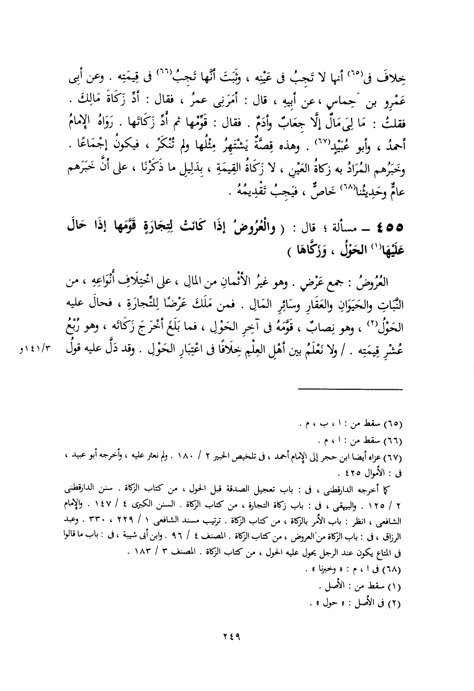 خِلافَ فى (٦٥) أنها لا تَجِبُ فى عَيْنِه، وثَبَتَ أنَّها تَجِبُ (٦٦) فى قِيمَتِه. وعن أبِى عَمْرِو بنَ حِماسٍ، عن أبِيهِ، قال: أمَرَنِى عمرُ، فقال: أدِّ زَكَاةَ مَالِكَ. فقلتُ: مَا لِىَ مَالٌ إلَّا جِعَابٌ وأدَمٌ. فقال: قَوِّمْها ثم أَدِّ زَكَاتَها. رَوَاهُ الإِمامُ أحمدُ، وأبو عُبَيْدٍ (٦٧). وهذه قِصَّةٌ يَشْتَهِرُ مِثْلُها ولم تُنْكَرْ، فيكونُ إجْمَاعًا. وخَبَرُهم المُرَادُ به زكاةُ العَيْنِ، لا زَكَاةُ القِيمَةِ، بِدَلِيلِ ما ذَكَرْنَا، على أنَّ خَبَرَهم عامٌّ وحَدِيثُنا (٦٨) خَاصٌّ، فيَجِبُ تَقْدِيمُهُ.