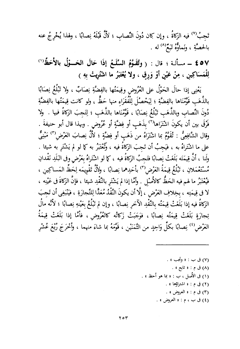 ٤٥٧ - مسألة؛ قال: (وتُقَوَّمُ السِّلَعُ إذَا حَالَ الحَوْلُ بالأَحَظِّ (١) لِلْمَسَاكِينِ، مِنْ عَيْنٍ أوْ وَرِقٍ، ولا يُعْتَبَرُ ما اشْتُرِيتْ بِهِ)