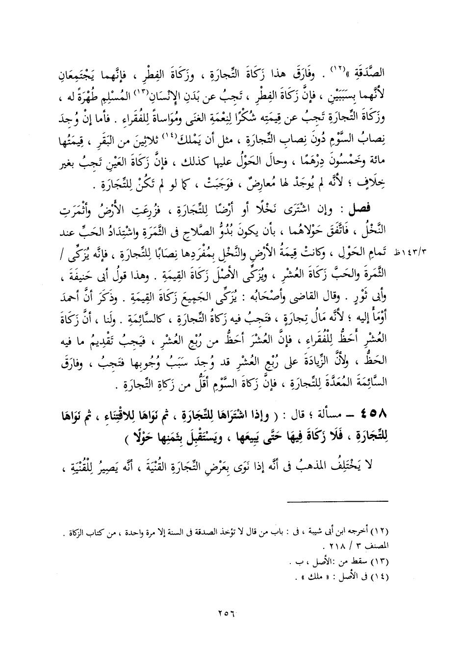 الصَّدَقَةِ" (١٢). وفَارَقَ هذا زَكَاةَ التِّجارَةِ، وزَكَاةَ الفِطْرِ، فإنَّهما يَجْتَمِعَانِ لأنَّهما بِسَبَبَيْنِ، فإنَّ زَكَاةَ الفِطْرِ، تَجِبُ عن بَدَنِ الإِنْسَانِ (١٣) المُسْلِمِ طُهْرَةً له، وزَكَاةَ التِّجارَةِ تَجِبُ عن قِيمَتِه شُكْرًا لِنِعْمَةِ الغنَى ومُوَاساةً لِلفُقَراءِ. فأما إنْ وُجِدَ نِصابُ السَّوْمِ دُونَ نِصابِ التِّجارَةِ، مثل أن يَمْلكَ (١٤) ثلاثِينَ من البَقَرِ، قِيمَتُها مائة وخَمْسُونَ دِرْهَمًا، وحالَ الحَوْلُ عليها كذلك، فإنَّ زَكَاةَ العَيْنِ تَجِبُ بغير خِلَافٍ؛ لأنَّه لم يُوجَدْ لها مُعارِضٌ، فوَجَبَتْ، كما لو لم تَكُنْ لِلتِّجَارَةِ.