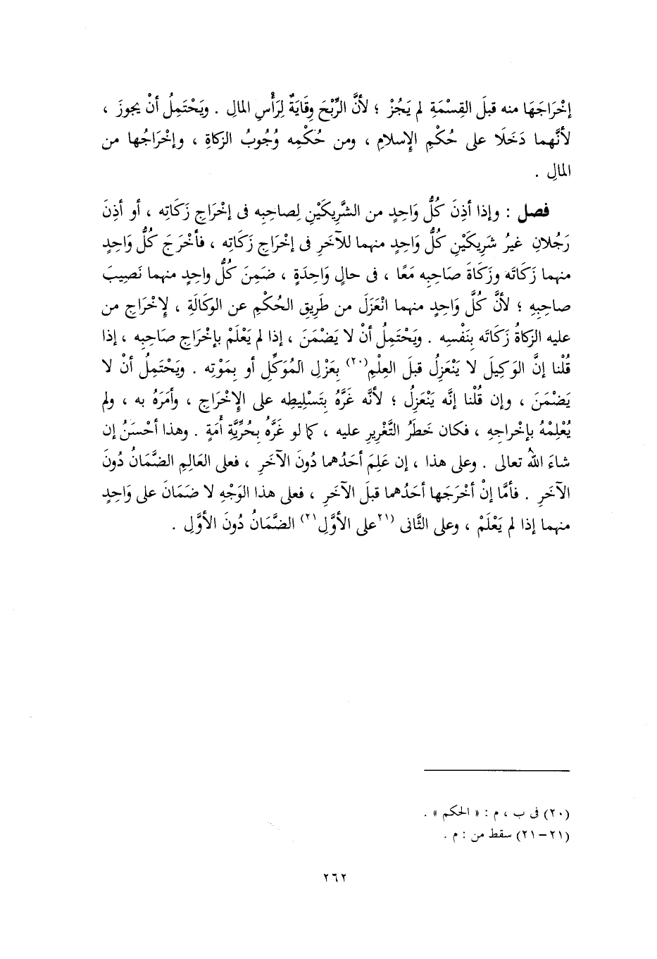 فصل: وإذا أذِنَ كُلُّ وَاحِدٍ من الشَّرِيكَيْنِ لِصاحِبِه فى إخْرَاجِ زَكَاتِه، أو أذِنَ رَجُلانِ غيرُ شَرِيكَيْنِ كُلُّ وَاحِدٍ منهما للآخَرِ فى إخْرَاجِ زَكَاتِه، فأخْرَجَ كُلُّ وَاحِدٍ منهما زَكَاتَه وزَكَاةَ صَاحِبِه مَعًا، فى حالٍ وَاحِدَةٍ، ضَمِنَ كُلُّ واحِدٍ منهما نَصِيبَ صاحِبِهِ؛ لأنَّ كُلَّ وَاحِدٍ منهما انْعَزَلَ من طَرِيقِ الحُكْمِ عن الوكَالَةِ، لإِخْرَاجِ من عليه الزَّكاةُ زَكَاتَه بِنَفْسِه. ويَحْتَمِلُ أنْ لا يَضْمَنَ، إذا لم يَعْلَمْ بإخْرَاجِ صَاحِبِه، إذا قُلْنا إنَّ الوَكِيلَ لا يَنْعَزِلُ قبلَ العِلْمِ (٢٠) بِعَزْلِ المُوَكِّلِ أو بِمَوْتِه. ويَحْتَمِلُ أنْ لا يَضْمَنَ، وإن قُلْنا إنَّه يَنْعَزِلُ؛ لأنَّه غَرَّهُ بِتَسْلِيطِه على الإِخْرَاجِ، وأمَرَهُ به، ولم يُعْلِمْهُ بإخْراجِهِ، فكان خَطَرُ التَّغْرِيرِ عليه، كما لو غَرَّهُ بِحُرِّيَّةِ أَمَةٍ. وهذا أحْسَنُ إن شاءَ اللهُ تعالى. وعلى هذا، إن عَلِمَ أحَدُهما دُون الآخَرِ، فعلى العَالِمِ الضَّمَانُ دُونَ الآخَرِ. فأمَّا إنْ أخْرَجَها أحَدُهما قبلَ الآخَرِ، فعلى هذا الوَجْهِ لا ضَمَانَ على وَاحِدٍ منهما إذا لم يَعْلَمْ، وعلى الثَّانِى [على الأوَّلِ] (٢١) الضَّمَانُ دُونَ الأوَّلِ.