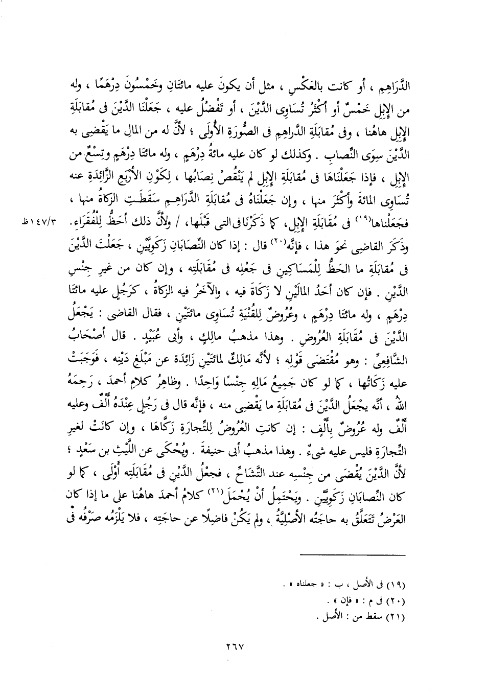 الدَّرَاهِمِ، أو كانت بالعَكْسِ، مثل أن يكونَ عليه مائتَانِ وخَمْسُونَ دِرْهَمًا، وله من الإِبِلِ خَمْسٌ أو أَكْثَرُ تُسَاوِى الدَّيْنَ، أو تَفْضُلُ عليه، جَعَلْنَا الدَّيْنَ فى مُقابَلَةِ الإِبِلِ هاهُنا، وفى مُقابَلَةِ الدَّراهِمِ فى الصُّورَةِ الأُولَى؛ لأنَّ له من المالِ ما يَقْضِى به الدَّيْنَ سِوَى النِّصابِ. وكذلك لو كان عليه مائةُ دِرْهَمٍ، وله مائتَا دِرْهَمٍ وتِسْعٌ من الإِبِلِ، فإذا جَعَلْنَاهَا فى مُقابَلَةِ الإِبِلِ لم يَنْقُصْ نِصَابُها، لِكَوْنِ الأرْبَعِ الزَّائِدَةِ عنه تُسَاوِى المائةَ أَكْثَرَ منها، وإن جَعَلْنَاهُ فى مُقابَلَةِ الدَّرَاهِمِ سَقَطَتِ الزكاةُ منها، فجَعَلْناها (١٩) فى مُقَابَلَةِ الإِبِلِ، كما ذَكَرْنَا فى التى قَبْلَها، ولأنَّ ذلك أحَظُّ لِلْفُقَرَاءِ. وذَكَرَ القاضِى نحوَ هذا، فإنَّه (٢٠) قال: إذا كان النِّصَابَانِ زَكَوِيَّيْنِ، جَعَلْتَ الدَّيْنَ فى مُقابَلَةِ ما الحَظُّ لِلْمَسَاكِينِ فى جَعْلِه فى مُقَابَلَتِه، وإن كان من غيرِ جِنْسِ الدَّيْنِ. فإن كان أحَدُ المالَيْنِ لا زَكَاةَ فيه، والآخَرُ فيه الزكاةُ، كرَجُلٍ عليه مائتَا دِرْهَمٍ، وله مائتَا دِرْهَمٍ، وعُرُوضٌ لِلقُنْيَةِ تُسَاوِى مائتَيْنِ، فقال القاضى: يَجْعَلُ الدَّيْنَ فى مُقَابَلَةِ العُرُوضِ. وهذا مذهبُ مالِكٍ، وأبى عُبَيْدٍ. قال أصْحَابُ الشَّافِعِىِّ: وهو مُقْتَضَى قَوْلِه؛ لأنَّه مَالِكٌ لمائتَيْنِ زَائِدَة عن مَبْلَغِ دَيْنِه، فَوَجَبَتْ عليه زَكَاتُها، كما لو كان جَمِيعُ مَالِهِ جِنْسًا وَاحِدًا. وظاهِرُ كلامِ أحمدَ، رَحِمَهُ اللهُ، أنَّه يجْعَلُ الدَّيْنَ فى مُقابَلَةِ ما يَقْضِى منه، فإنَّه قال فى رَجُلٍ عِنْدَهُ أَلْفٌ وعليه ألْفٌ وله عُرُوضٌ بِألْفٍ: إن كانتِ العُرُوضُ لِلتِّجارَةِ زَكَّاهَا، وإن كانَتْ لغيرِ التِّجارَةِ فليس عليه شىءٌ. وهذا مذهبُ أبي حنيفةَ. ويُحْكَى عن اللَّيْثِ بن سَعْدٍ؛ لأنَّ الدَّيْنَ يُقْضَى من جِنْسِه عند التَّشَاحِّ، فجعْلُ الدَّيْنِ فى مُقَابَلَتِه أَوْلَى، كما لو كان النِّصابَانِ زَكَوِيَّيْنِ. ويَحْتَمِلُ أنْ يُحْمَلَ (٢١) كلامُ أحمدَ هاهُنا على ما إذا كان العَرْضُ تَتَعَلَّقُ به حاجَتُه الأصْلِيَّةُ، ولم يَكُنْ فاضِلًا عن حاجَتِه، فلا يَلْزَمُه صَرْفُه فى