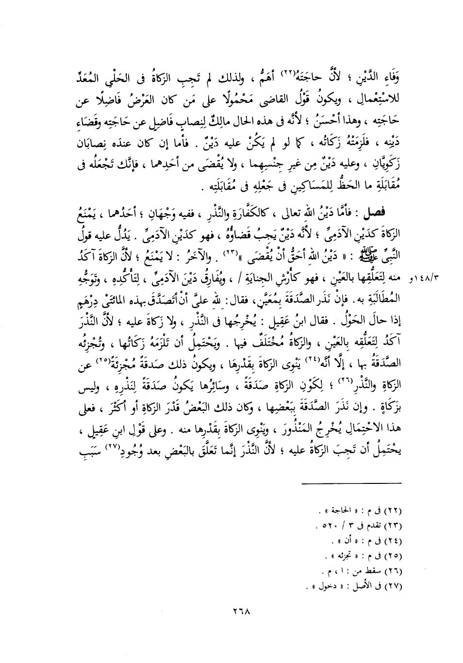 فصل: فأمَّا دَيْنُ اللهِ تعالى، كالكَفَّارَةِ والنَّذْرِ، ففيه وَجْهَانِ؛ أحَدُهما، يَمْنَعُ الزكاةَ كدَيْنِ الآدَمِىِّ، لأَنَّه دَيْنٌ يَجِبُ قَضاؤُهُ، فهو كدَيْنِ الآدَمِىِّ. يَدُلُّ عليه قولُ النَّبِيِّ -صَلَّى اللهُ عَلَيْهِ وَسَلَّمَ-: "دَيْنُ اللهِ أحَقُّ أنْ يُقْضَى" (٢٣). والآخَرُ: لا يَمْنَعُ؛ لأنَّ الزكاةَ آكَدُ منه لِتَعَلُّقِها بالعَيْنِ، فهو كأَرْشِ الجِنايَةِ، ويُفَارِقُ دَيْنَ الآدَمِىِّ، لِتأَكُّدِهِ، وتَوَجُّهِ المُطَالَبَةِ به. فإنْ نَذَر الصَّدَقَةَ بِمُعَيَّنٍ، فقال: للهِ علىَّ أنْ أَتَصَدَّقَ بهذه المائتَىْ دِرْهَمٍ إذا حالَ الحَوْلُ. فقال ابنُ عَقِيلٍ: يُخْرِجُها فى النَّذْرِ، ولا زَكاةَ عليه؛ لأنَّ النَّذْرَ آكَدُ لِتَعَلُّقِه بِالعَيْنِ، والزكاةُ مُخْتَلَفٌ فيها. ويَحْتَمِلُ أن تَلْزَمَهُ زَكَاتُها، وتُجْزِئُه الصَّدَقَةُ بها، إلَّا أَنَّه (٢٤) يَنْوِى الزكاةَ بِقَدْرِهَا، ويكونُ ذلك صَدقَةً مُجْزِئَةً (٢٥) عن الزكاةِ والنَّذْرِ (٢٦)؛ لِكَوْنِ الزكاةِ صَدَقَةً، وسَائِرُها يَكونُ صَدَقَةً لِنَذْرِهِ، وليس بزَكَاةٍ. وإن نَذَرَ الصَّدَقَةَ بِبَعْضِها، وكان ذلك البَعْضُ قَدْرَ الزكاةِ أو أَكَثْرَ، فعلى هذا الاحْتِمَالِ يُخْرِجُ المَنْذُورَ، ويَنْوِى الزكاةَ بِقَدْرِها منه. وعلى قَوْلِ ابنِ عَقِيلٍ، يحْتَمِلُ أن تَجِبَ الزكاةُ عليه؛ لأنَّ النَّذْرَ إنَّما تَعَلَّقَ بالبَعْضِ بعد وُجُودِ (٢٧) سَبَبِ