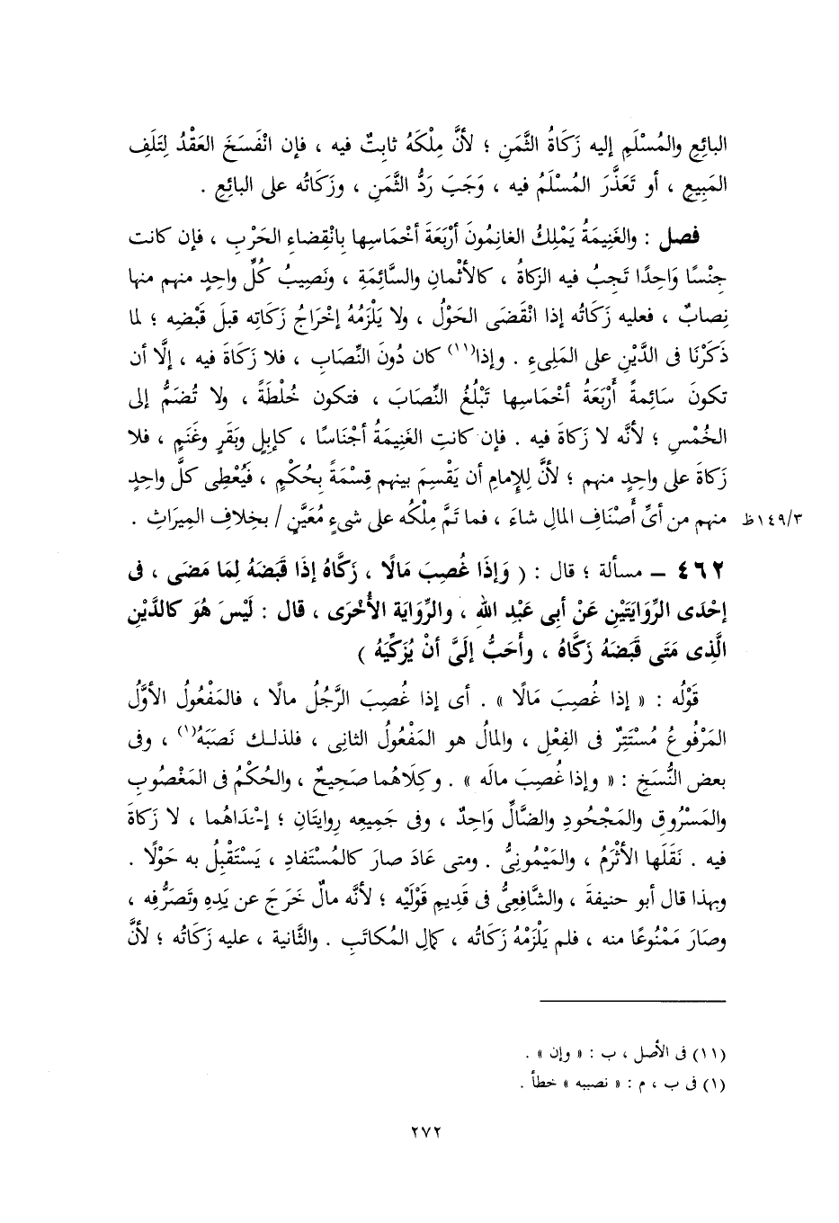 قَوْلُه: "إذا غُصِبَ مَالًا". أى إذا غُصِبَ الرَّجُلُ مالًا، فالمَفْعُولُ الأوَّلُ المَرْفُوعُ مُسْتَتِرٌ فى الفِعْلِ، والمالُ هو المَفْعُولُ الثانِى، فلذلك نَصَبَهُ (١)، وفى بعض النُّسَخِ: "وإذا غُصِبَ مالَه". وكِلَاهُما صَحِيحٌ، والحُكْمُ فى الْمَغْصُوبِ والمَسْرُوقِ والمَجْحُودِ والضَّالِّ وَاحِدٌ، وفى جَمِيعِه رِوايتَانِ؛ إِحْدَاهُما، لا زَكاةَ فيه. نَقَلَها الأَثْرَمُ، والمَيْمُونِىُّ. ومتى عَادَ صارَ كالمُسْتَفادِ، يَسْتَقْبِلُ به حَوْلًا. وبهذا قال أبو حنيفةَ، والشَّافِعِىُّ فى قَدِيمِ قَوْلَيْه، لأنَّه مالٌ خَرَجَ عن يَدِهِ وتَصَرُّفِه، وصَارَ مَمْنُوعًا منه، فلم يَلْزَمْهُ زَكَاتُه، كمالِ المُكاتَبِ. والثَّانية، عليه زَكَاتُه؛ لأنَّ