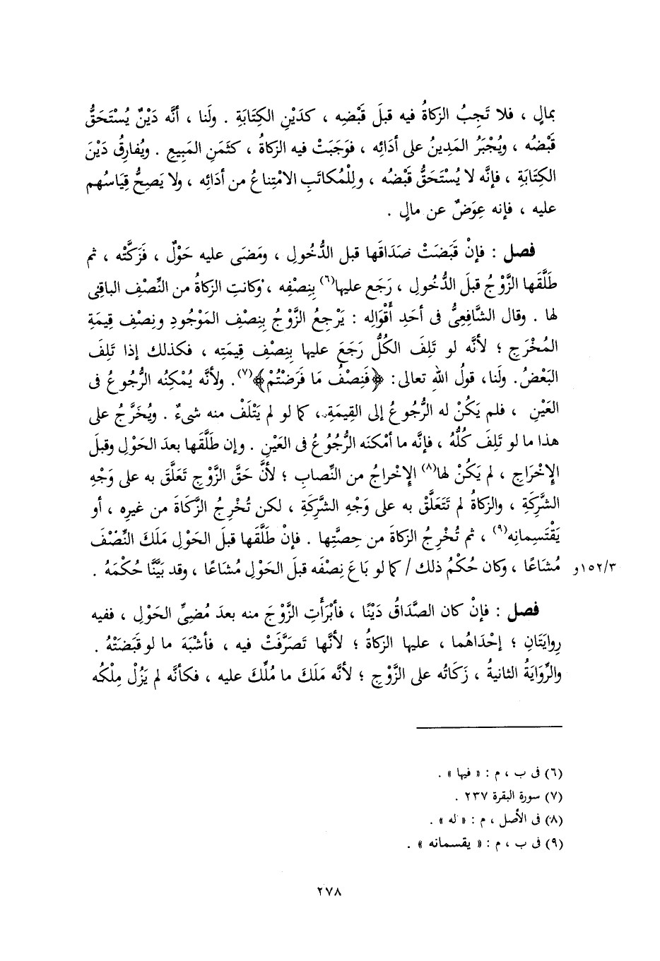 فصل: فإنْ قَبَضَتْ صَدَاقَها قبل الدُّخُولِ، ومَضَى عليه حَوْلٌ، فَزَكَّتْه، ثم طَلَّقَها الزَّوْجُ قبلَ الدُّخُولِ، رَجَع عليها (٦) بِنِصْفِه، وكانتِ الزكاةُ من النِّصْفِ الباقِى لها. وقال الشَّافِعِيُّ في أحَدِ أقْوَالِه: يَرْجِعُ الزَّوْجُ بِنِصْفِ المَوْجُودِ ونِصْفِ قِيمَةِ المُخْرَجِ؛ لأنَّه لو تَلِفَ الكُلُّ رَجَعَ عليها بِنِصْفِ قِيمَتِه، فكذلك إذا تَلِفَ البَعْضُ. ولَنا، قولُ اللهِ تعالى: {فَنِصْفُ مَا فَرَضْتُمْ} (٧). ولأنَّه يُمْكِنُه الرُّجُوعُ في العَيْنِ، فلم يَكُنْ له الرُّجُوعُ إلى القِيمَةِ، كما لو لم يَتْلَفْ منه شىءٌ. ويُخَرَّجُ على هذا ما لو تَلِفَ كُلُّهُ، فإنَّه ما أمْكنَه الرُّجُوعُ في العَيْنِ. وإن طَلَّقَها بعدَ الحَوْلِ وقبلَ الإخْرَاجِ، لم يَكُنْ لها (٨) الإخْراجُ من النِّصابِ، لأنَّ حَقَّ الزَّوْجِ تَعَلَّقَ به على وَجْهِ الشَّرِكَةِ، والزكاةُ لم تَتَعَلَّقْ به على وَجْهِ الشَّرِكَةِ، لكن تُخْرِجُ الزَّكَاةَ من غيرِه، أو يَقْتَسِمانِه (٩)، ثم تُخْرِجُ الزكاةَ من حِصَّتِها. فإنْ طَلَّقَها قبلَ الحَوْلِ مَلَكَ النِّصْفَ مُشَاعًا، وكان حُكْمُ ذلك كما لو بَاعَ نِصْفَه قبلَ الحَوْلِ مُشَاعًا، وقد بَيَّنَّا حُكْمَهُ.