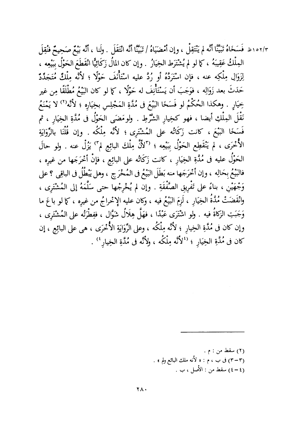 فَسَخَاهُ تَبَيَّنَّا أنَّه لم يَنْتَقِلْ، وإن أمْضَيَاهُ تَبَيَّنَّا أنَّه انتقَلَ. ولَنا، أنَّه بَيْعٌ صَحِيحٌ فنُقِلَ المِلْكُ عَقِيبَهُ، كما لو لم يُشْتَرَط الخِيَارُ. وإن كان المالُ زَكَائِيًّا انْقَطَعَ الحَوْلُ بِبَيْعِه، لِزَوَالِ مِلْكِه عنه، فإن اسْتَرَدَّهُ أو رُدَّ عليه اسْتَأْنَفَ حَوْلًا؛ لأنَّه مِلْكٌ مُتَجَدِّدٌ حَدَثَ بعد زَوَالِه، فوَجَبَ أن يَسْتَأْنِفَ له حَوْلًا، كما لو كان البَيْعُ مُطْلَقًا مِن غير خِيَارٍ. وهكذا الحُكْمُ لو فَسَخَا البَيْعَ في مُدَّةِ المَجْلِسِ بخِيَارِه؛ لأنَّه (٢) لا يَمْنَعُ نَقْلَ المِلْكِ أيضا، فهو كخِيارِ الشَّرْطِ. ولو مَضَى الحَوْلُ في مُدَّةِ الخِيَارِ، ثم فَسَخَا البَيْعَ، كانت زَكَاتُه على المُشْتَرِي؛ لأنَّه مِلْكُه. وإن قُلْنَا بالرِّوَايَةِ الأُخْرَى، لم يَنْقَطِع الحَوْلُ بِبَيْعِه؛ [لأنَّ مِلْكَ البائِعِ لم] (٣) يَزُلْ عنه. ولو حالَ الحَوْلُ عليه في مُدَّةِ الخِيَارِ، كانت زَكَاتُه على البائِعِ، فإنْ أخْرَجَها من غيرِه، فالبَيْعُ بِحَالِه، وإن أخْرَجَها منه بَطَلَ البَيْعُ في المُخْرَجِ، وهل يَبْطُلُ في الباقِى؟ على وَجْهَيْنِ، بناءً على تَفْرِيقِ الصَّفْقَةِ. وإن لم يُخْرِجْها حتى سَلَّمَهُ إلى المُشْتَرِي، وانْقَضَتْ مُدَّةُ الخِيَارِ، لَزِمَ البَيْعُ فيه، وكان عليه الإخْراجُ من غيرِه، كما لو باعَ ما وَجَبَتِ الزكاةُ فيه. ولو اشْتَرَى عَبْدًا، فهَلَّ هِلَالُ شَوَّال، ففِطْرَتُه على المُشْتَرِي، وإن كان في مُدَّةِ الخِيارِ؛ لأنَّه مِلْكُه، وعلى الرِّوَايَةِ الأُخْرَى، هى على البائِعِ، إن كان في مُدَّةِ الخِيَارِ؛ [لأنَّه مِلْكُه، ولأنَّه في مُدَّةِ الخِيارِ] (٤).