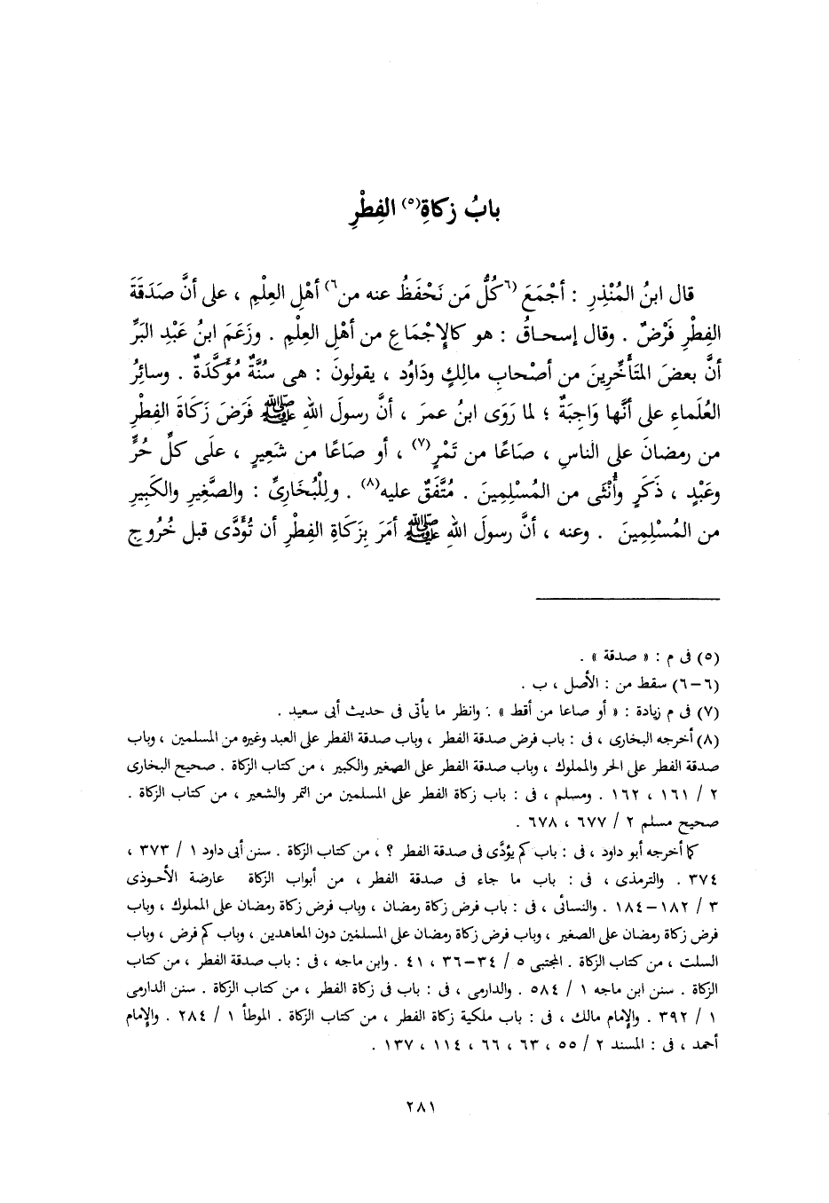 (٨) أخرجه البخاري، في: باب فرض صدقة الفطر، وباب صدقة الفطر على العبد وغيره من المسلمين، وباب صدقة الفطر على الحر والمملوك، وباب صدقة الفطر على الصغير والكبير، من كتاب الزكاة. صحيح البخاري ٢/ ١٦١، ١٦٢. ومسلم، في: باب زكاة الفطر على المسلمين من التمر والشعير، من كتاب الزكاة. صحيح مسلم ٢/ ٦٧٧، ٦٧٨.