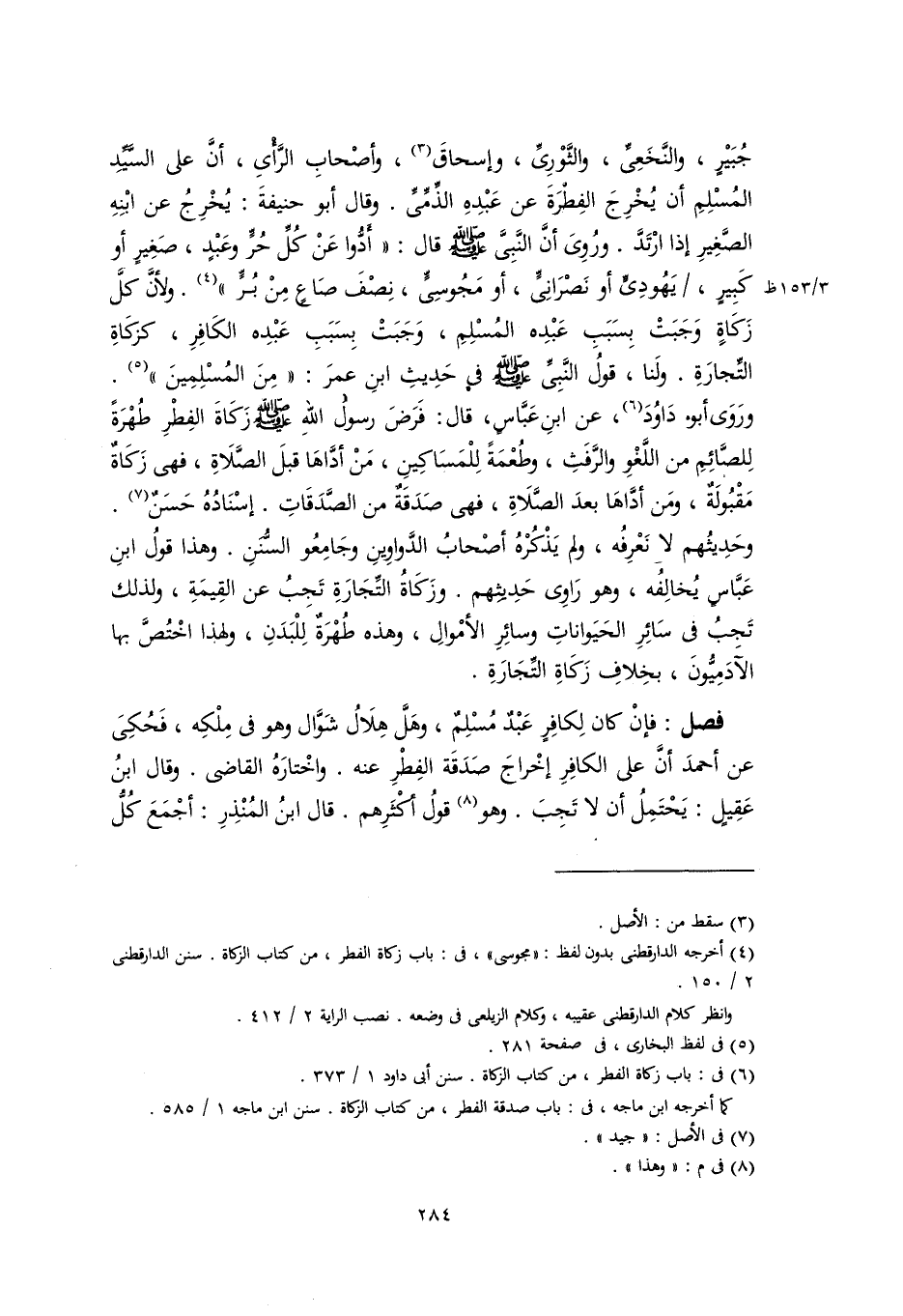جُبَيْرٍ، والنَّخَعِىِّ، والثَّوْرِىِّ، وإسحاقَ (٣)، وأصْحابِ الرَّأْىِ، أنَّ على السَّيِّدِ المُسْلِمِ أن يُخْرِجَ الفِطْرَةَ عن عَبْدِهِ الذِّمِّيِّ. وقال أبو حنيفةَ: يُخْرِجُ عن ابْنِهِ الصَّغِيرِ إذا ارْتَدَّ. ورُوِىَ أنَّ النَّبِيَّ -صَلَّى اللهُ عَلَيْهِ وَسَلَّمَ- قال: "أَدُّوا عَنْ كُلِّ حُرٍّ وعَبْدٍ، صَغِيرٍ أو كَبِيرٍ، يَهُودِيٍّ أو نَصْرَانِيٍّ، أو مَجُوسِيٍّ، نِصْفَ صَاعٍ مِنْ بُرٍّ" (٤). ولأنَّ كلَّ زَكَاةٍ وَجَبَتْ بِسَبَبِ عَبْدِه المُسْلِمِ، وَجَبَتْ بِسَبَبِ عَبْدِه الكَافِرِ، كزكَاةِ التِّجارَةِ. ولَنا، قولُ النَّبِيِّ -صَلَّى اللهُ عَلَيْهِ وَسَلَّمَ- في حَدِيثِ ابنِ عمرَ: "مِنَ المُسْلِمِينَ" (٥). ورَوَى أبو دَاوُدَ (٦)، عن ابنِ عَبَّاسٍ، قال: فَرَضَ رسولُ اللهِ -صَلَّى اللهُ عَلَيْهِ وَسَلَّمَ- زَكَاةَ الفِطْرِ طُهْرَةً لِلصَّائِمِ من اللَّغْوِ والرَّفَثِ، وطُعْمَةً لِلْمَسَاكِينِ، مَنْ أدَّاهَا قبلَ الصَّلَاةِ، فهى زَكَاةٌ مَقْبُولَةٌ، ومَن أدَّاهَا بعدَ الصَّلَاةِ، فهى صَدَقَةٌ من الصَّدَقَاتِ. إسْنَادُهُ حَسَنٌ (٧). وحَدِيثُهم لا نَعْرِفُه، ولم يَذْكُرْهُ أصْحابُ الدَّواوِينِ وجَامِعُو السُّنَنِ. وهذا قولُ ابنِ عَبَّاسٍ يُخالِفُه، وهو رَاوِى حَدِيثِهم. وزَكَاةُ التِّجَارَةِ تَجِبُ عن القِيمَةِ، ولذلك تَجِبُ في سَائِرِ الحَيَواناتِ وسائِرِ الأمْوالِ، وهذه طُهْرَةٌ لِلْبَدَنِ، ولهذا اخْتُصَّ بها الآدَمِيُّونَ، بخِلافِ زَكَاةِ التِّجَارَةِ.