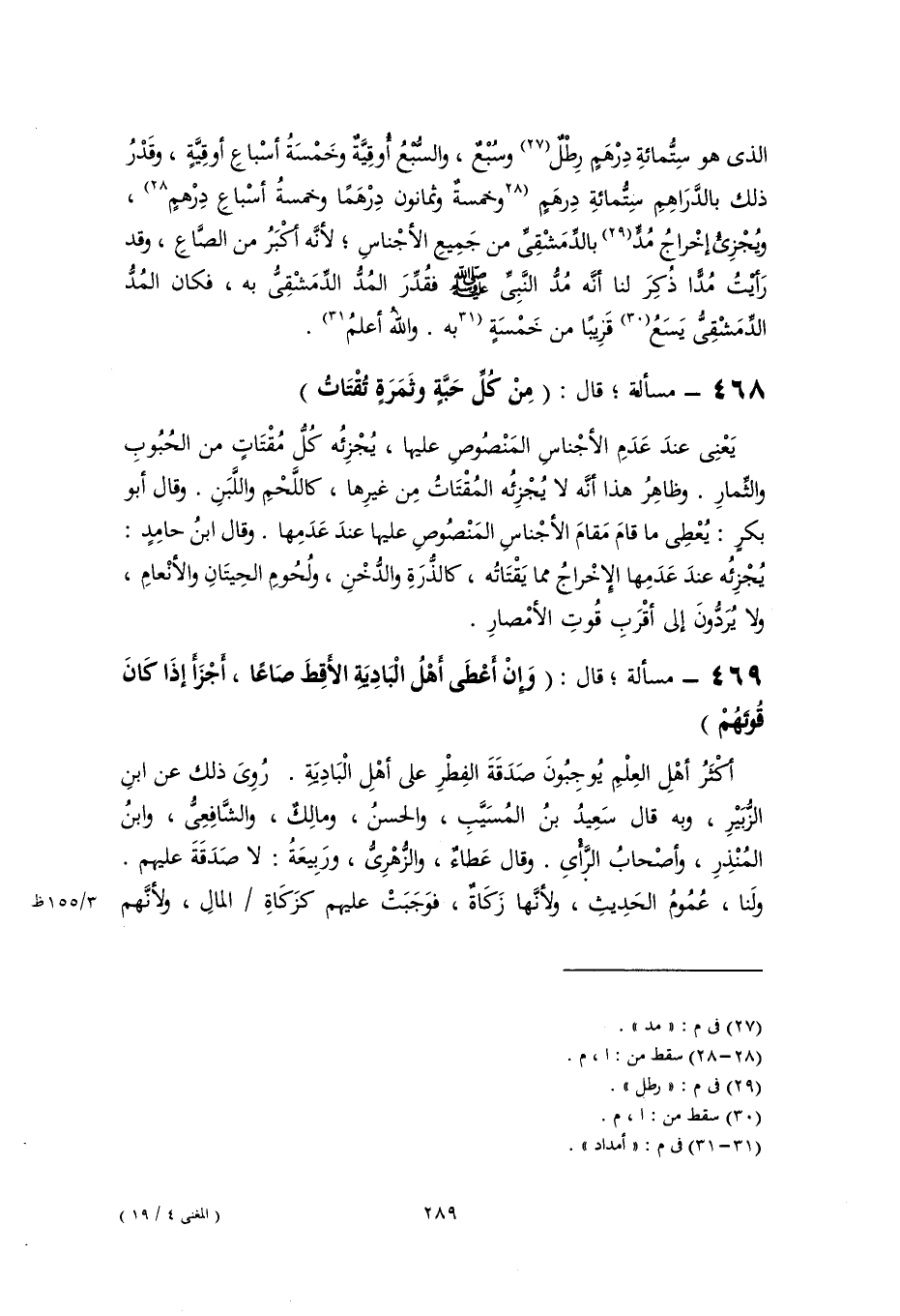 الذى هو سِتُّمائةِ دِرْهَمٍ رِطْلٌ (٢٧) وسُبْعٌ، والسُّبْعُ أُوقِيَّةٌ وخَمْسَةُ أسْباعِ أوقِيَّةٍ، وقَدْرُ ذلك بالدَّرَاهِمِ سِتُّمائةِ دِرهَمٍ [وخمسةٌ وثمانون دِرْهَمًا وخمسةُ أسْباعِ دِرْهمٍ] (٢٨)، ويُجْزِئُ إخْراجُ مُدٍّ (٢٩) بالدِّمَشْقِيِّ من جَمِيعِ الأجْناسِ؛ لأنَّه أكْبَرُ من الصَّاعِ، وقد رَأيْتُ مُدًّا ذُكِرَ لنا أنَّه مُدُّ النَّبِيِّ -صَلَّى اللهُ عَلَيْهِ وَسَلَّمَ- فقُدِّرَ المُدُّ الدِّمَشْقِىُّ به، فكان المُدُّ الدِّمَشْقِىُّ يَسَعُ (٣٠) قَرِيبًا من خَمْسَةٍ [به. واللَّه أعلمُ] (٣١).