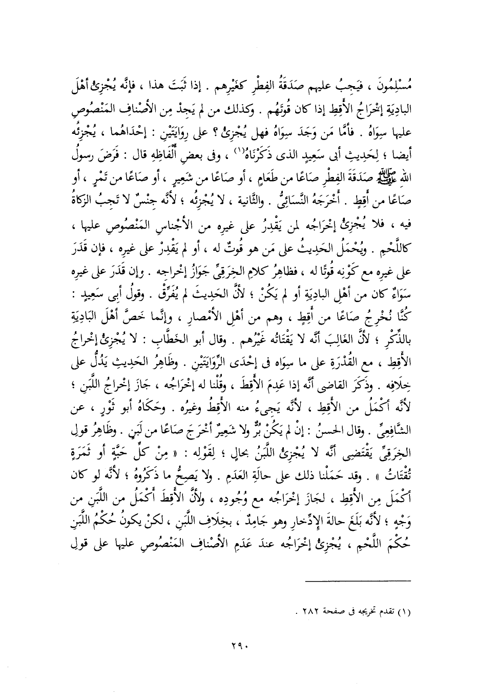 مُسْلِمُونَ، فيَجِبُ عليهم صَدَقَةُ الفِطْرِ كغَيْرِهم. إذا ثَبَتَ هذا، فإنَّه يُجْزِئُ أهْلَ البادِيَةِ إخْرَاجُ الأَقِطِ إذا كان قُوتَهُم. وكذلك من لم يَجِدْ مِن الأصْنافِ المَنْصُوصِ عليها سِوَاهُ. فأمَّا مَن وَجَدَ سِوَاهُ فهل يُجْزِئُ؟ على رِوَايَتَيْنِ: إحْدَاهُما، يُجْزِئُه أيضا؛ لِحَدِيثِ أبى سَعِيدٍ الذى ذَكَرْنَاهُ (١)، وفى بعضِ أَلْفَاظِهِ قال: فَرَضَ رسولُ اللهِ -صَلَّى اللهُ عَلَيْهِ وَسَلَّمَ- صَدَقَةَ الفِطْرِ صَاعًا من طَعَامٍ، أو صَاعًا من شَعِيرٍ، أو صَاعًا من تَمْرٍ، أو صَاعًا من أقِطٍ. أخْرَجَهُ النَّسَائِىُّ. والثَّانية، لا يُجْزِئُه؛ لأنَّه جِنْسٌ لا تَجِبُ الزكاةُ فيه، فلا يُجْزئُ إخْرَاجُه لمن يَقْدِرُ على غيرِه من الأجْناسِ المَنْصُوصِ عليها، كاللَّحْمِ. ويُحْمَلُ الحَدِيثُ على مَن هو قُوتٌ له، أو لم يَقْدِرْ على غيرِه، فإن قَدَرَ على غيرِه مع كَوْنِه قُوتًا له، فظاهِرُ كلامِ الخِرَقِىِّ جَوَازُ إخْراجِه. وإن قَدَرَ على غيرِه سَوَاءٌ كان من أهْلِ البادِيَةِ أو لم يَكُنْ؛ لأنَّ الحَدِيثَ لم يُفَرِّقْ. وقولُ أبِى سَعِيدٍ: كُنَّا نُخْرِجُ صَاعًا من أقِطٍ، وهم من أهْلِ الأمْصارِ، وإنَّما خَصَّ أهْلَ البَادِيَةِ بالذِّكْرِ؛ لأنَّ الغَالِبَ أنَّه لا يَقْتَاتُه غَيْرُهم. وقال أبو الخَطَّابِ: لا يُجْزِئُ إخْراجُ الأَقِطِ، مع القُدْرَةِ على ما سِوَاه فى إحْدَى الرِّوَايَتَيْنِ. وظَاهِرُ الحَدِيثِ يَدُلُّ على خِلَافِه. وذَكَرَ القاضى أنَّه إذا عَدِمَ الأقِطَ، وقُلْنا له إخْرَاجُه، جَازَ إخْراجُ اللَّبَنِ؛ لأنَّه أكْمَلُ من الأقِطِ، لأنَّه يَجِىءُ منه الأَقِطُ وغيرُه. وحَكَاهُ أبو ثَوْرٍ، عن الشَّافِعِىِّ. وقال الحسنُ: إنْ لم يَكُنْ بُرٌّ ولا شَعِيرٌ أخْرَجَ صَاعًا من لَبَنٍ. وظَاهِرُ قولِ الخِرَقِىِّ يَقْتَضِى أنَّه لا يُجْزِئُ اللَّبَنُ بحالٍ؛ لِقَوْلِه: "مِنْ كلِّ حَبَّةٍ أو ثَمَرَةٍ تُقْتَاتُ". وقد حَمَلْنا ذلك على حالَةِ العَدَمِ. ولا يَصِحُّ ما ذَكَرُوهُ؛ لأنَّه لو كان أكْمَلَ مِن الأَقِطِ، لجَازَ إخْرَاجُه مع وُجُودِه، ولأنَّ الأقِطَ أَكْمَلُ من اللَّبَنِ من وَجْهٍ؛ لأنَّه بَلَغَ حالةَ الإدِّخارِ وهو جَامِدٌ، بخِلَافِ اللَّبَنِ، لكنْ يكونُ حُكْمُ اللَّبَنِ حُكْمَ اللَّحْمِ، يُجْزِئُ إخْرَاجُه عندَ عَدَمِ الأَصْنافِ المَنْصُوصِ عليها على قولِ