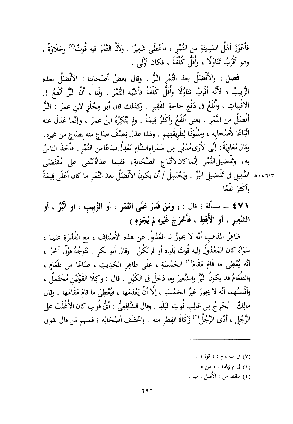 فصل: والأفْضَلُ بعدَ التَّمْرِ البُرُّ. وقال بعضُ أصْحابِنا: الأفْضَلُ بعدَه الزَّبِيبُ؛ لأنَّه أقْرَبُ تَنَاوُلًا وأقَلُّ كُلْفَةً فأشْبَه التَّمْرَ. ولَنا، أنَّ البُرَّ أنْفَعُ فى الاقْتِياتِ، وأبْلَغُ فى دَفْعِ حاجةِ الفَقِيرِ. وكذلك قال أبو مِجْلَزٍ لابنِ عمرَ: البُرُّ أفْضَلُ من التَّمْرِ. يعنى أنْفَعُ وأكْثَرُ قِيمَةً. ولم يُنْكِرْهُ ابنُ عمرَ، وإنَّما عَدَلَ عنه اتِّبَاعًا لأصْحابِه، وسُلُوكًا لِطَرِيقَتِهم. ولهذا عدَل نِصْفَ صَاعٍ منه بِصَاعٍ من غيرِه. وقال مُعَاوِيَةُ: إنِّى لأرَى مُدَّيْنِ مِن سَمْراءِ الشَّامِ يَعْدِلُ صَاعًا من التَّمْرِ. فأخَذَ الناسُ به، وتَفْضِيلُ التَّمْرِ إنَّما كان لاتِّبَاعِ الصَّحَابةِ، ففيما عدَاهُ يَبْقَى على مُقْتَضَى الدَّلِيلِ فى تَفْضِيلِ البُرِّ. ويَحْتَمِلُ أن يكونَ الأفْضَلُ بعدَ التَّمْرِ ما كان أعْلَى قِيمَةً وأكْثَرَ نَفْعًا.