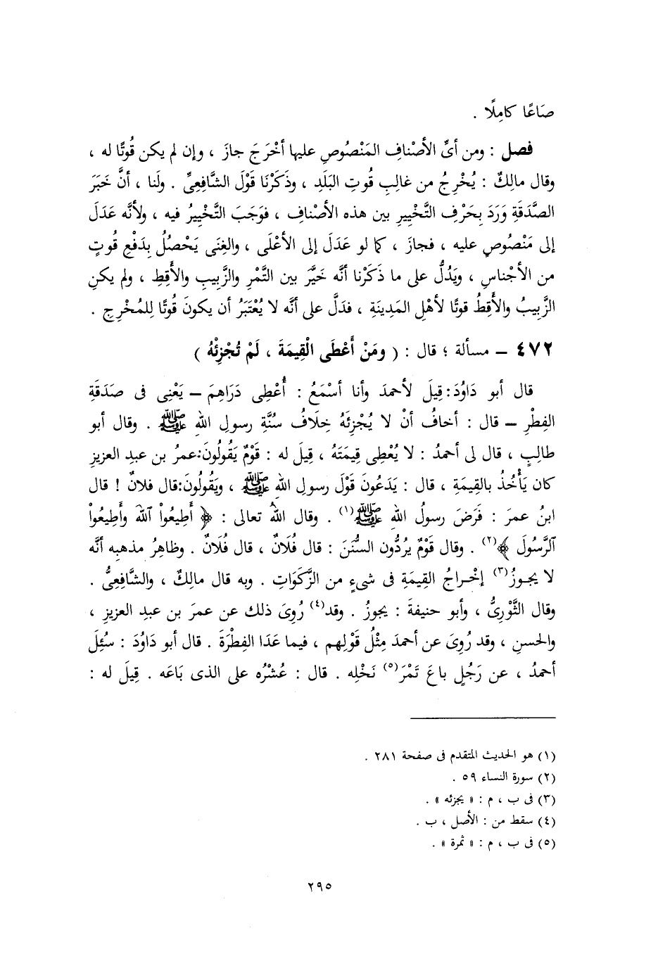 قال أبو دَاوُدَ: قِيلَ لأحمدَ وأنا أسْمَعُ: أُعْطِى دَرَاهِمَ -يَعْنِى فى صَدَقَةِ الفِطْرِ- قال: أخافُ أنْ لا يُجْزِئَهُ خِلَافُ سُنَّةِ رسولِ اللهِ -صَلَّى اللهُ عَلَيْهِ وَسَلَّمَ-. وقال أبو طالِبٍ، قال لى أحمدُ: لا يُعْطِى قِيمَتَهُ، قِيلَ له: قَوْمٌ يَقُولُونَ: عمرُ بن عبدِ العزيزِ كان يَأْخُذُ بالقِيمَةِ، قال: يَدَعُونَ قَوْلَ رسولِ اللهِ -صَلَّى اللهُ عَلَيْهِ وَسَلَّمَ-، ويَقُولُونَ: قال فلانٌ! قال ابنُ عمرَ: فَرَضَ رسولُ اللهِ -صَلَّى اللهُ عَلَيْهِ وَسَلَّمَ- (١). وقال اللهُ تعالى: {أَطِيعُوا اللَّهَ وَأَطِيعُوا الرَّسُولَ} (٢). وقال قَوْمٌ يرُدُّون السُّنَنَ: قال فُلَانٌ، قال فُلَانٌ. وظاهِرُ مذهبِه أنَّه لا يجوزُ (٣) إخْراجُ القِيمَةِ فى شىءٍ من الزَّكَوَاتِ. وبه قال مالِكٌ، والشَّافِعِىُّ. وقال الثَّوْرِىُّ، وأبو حنيفةَ: يجوزُ. وقد (٤) رُوِىَ ذلك عن عمرَ بن عبدِ العزيزِ، والحسنِ، وقد رُوِىَ عن أحمدَ مِثْلُ قَوْلِهم، فيما عَدَا الفِطْرَةَ. قال أبو دَاوُدَ: سُئِلَ أحمدُ، عن رَجُلٍ باعَ تَمْرَ (٥) نَخْلِه. قال: عُشْرُه على الذى بَاعَه. قِيلَ له: