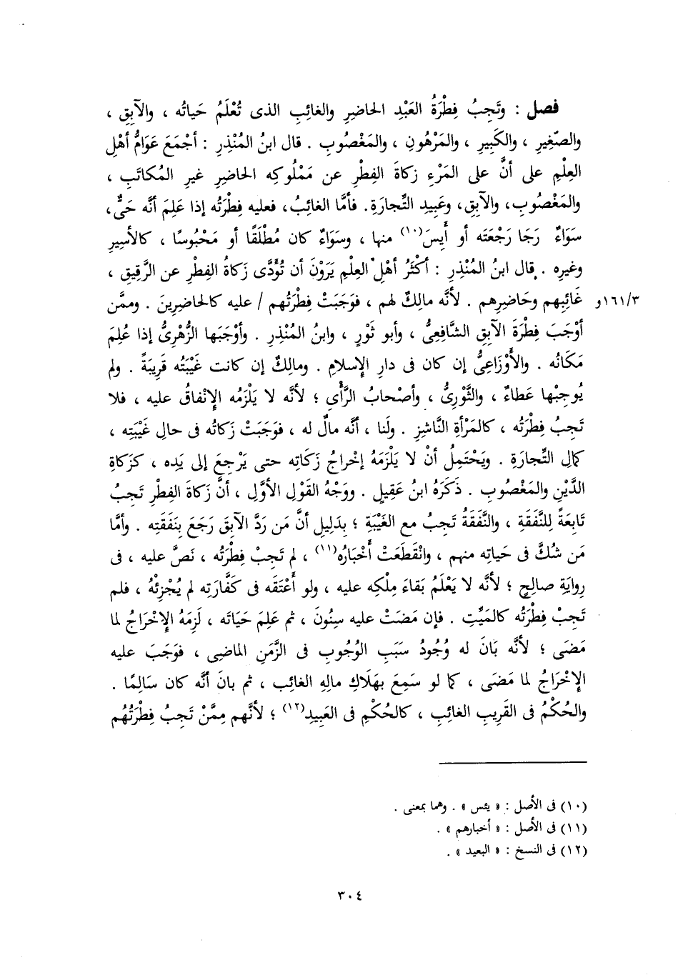 فصل: وتَجِبُ فِطْرَةُ العَبْدِ الحاضِرِ والغائِبِ الذى تُعْلَمُ حَياتُه، والآبِقِ، والصّغِيرِ، والكَبِيرِ، والمَرْهُونِ، والمَغْصُوبِ. قال ابنُ المُنْذِرِ: أجْمَعَ عَوَامُّ أهْلِ العِلْمِ على أنَّ على المَرْءِ زكاةَ الفِطْرِ عن مَمْلُوكِه الحاضِرِ غيرِ المُكاتَبِ، والمَغْصُوبِ، والآبِقِ، وعَبِيدِ التِّجارَةِ. فأمَّا الغائِبُ، فعليه فِطْرَتُه إذا عَلِمَ أنَّه حَىٌّ، سَوَاءٌ رَجَا رَجْعَتَه أو أَيِسَ (١٠) منها، وسَوَاءٌ كان مُطْلَقًا أو مَحْبُوسًا، كالأسِيرِ وغيرِه. قال ابنُ المُنْذِرِ: أكْثَرُ أهْلِ العِلْمِ يَرَوْنَ أن تُؤَدَّى زَكاةُ الفِطْرِ عن الرَّقِيقِ، غَائِبِهم وحَاضِرِهم. لأنَّه مالِكٌ لهم، فوَجَبَتْ فِطْرَتُهم عليه كالحاضِرِينَ. وممَّن أوْجَبَ فِطْرَةَ الآبِقِ الشَّافِعِىُّ، وأبو ثَوْرٍ، وابنُ المُنْذِرِ. وأوْجَبَها الزُّهْرِىُّ إذا عُلِمَ مَكَانُه. والأوْزَاعِىُّ إن كان فى دارِ الإِسلامِ. ومالِكٌ إن كانت غَيْبَتُه قَرِيبَةً. ولم يُوجِبْها عَطاءٌ، والثَّوْرِىُّ، وأصْحابُ الرَّأْىِ؛ لأنَّه لا يَلْزَمُه الإِنْفاقُ عليه، فلا تَجِبُ فِطْرَتُه، كالمَرْأةِ النَّاشِزِ. ولَنا، أنَّه مالٌ له، فوَجَبَتْ زَكاتُه فى حالِ غَيْبَتِه، كمالِ التِّجارَةِ. ويَحْتَمِلُ أنْ لا يَلْزَمَهُ إخْراجُ زَكَاتِه حتى يَرْجِعَ إلى يَدِه، كزَكاةِ الدَّيْنِ والمَغْصُوبِ. ذَكَرَهُ ابنُ عَقِيلٍ. ووَجْهُ القَوْلِ الأوَّلِ، أنَّ زَكاةَ الفِطْرِ تَجِبُ تَابِعَةً لِلنَّفَقَةِ، والنَّفَقَةُ تَجِبُ مع الغَيْبَةِ؛ بِدَلِيلِ أنَّ مَن رَدَّ الآبِقَ رَجَعَ بِنَفَقَتِه. وأمَّا مَن شُكَّ فى حَياتِه منهم، وانْقَطَعَتْ أَخْبَارُه (١١)، لم تَجِبْ فِطْرَتُه، نَصَّ عليه، فى رِوايَةِ صالِحٍ؛ لأنَّه لا يَعْلَمُ بَقاءَ مِلْكِه عليه، ولو أَعتَقَه فى كَفَّارَتِه لم يُجْزِئْهُ، فلم تَجِبْ فِطْرَتُه كالمَيِّتِ. فإن مَضَتْ عليه سِنُونَ، ثم عَلِمَ حَيَاتَه، لَزِمَهُ الإخْرَاجُ لما مَضَى؛ لأنَّه بَانَ له وُجُودُ سَبَبِ الوُجُوبِ فى الزَّمَنِ الماضِى، فوَجَبَ عليه الإخْرَاجُ لما مَضَى، كما لو سَمِعَ بهَلَاكِ مالِهِ الغائِب، ثم بانَ أنَّه كان سَالِمًا. والحُكْمُ فى القَرِيبِ الغائِبِ، كالحُكْمِ فى العَبِيدِ (١٢)؛ لأنَّهم مِمَّنْ تَجِبُ فِطْرَتُهُم