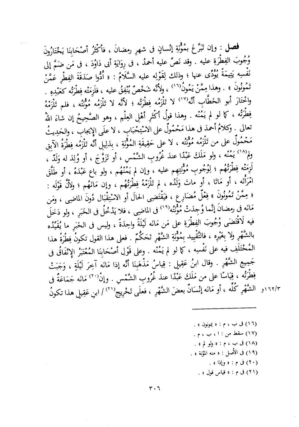 فصل: وإن تَبَرَّعَ بمُؤْنَةِ إنْسانٍ فى شهرِ رمضانَ، فأكْثَرُ أصْحَابِنَا يَخْتَارُونَ وُجُوبَ الفِطْرَةِ عليه. وقد نَصَّ عليه أحمدُ، فى رِوَايَةِ أبى دَاوُدَ، فى مَن ضَمَّ إلى نَفْسِه يَتِيمَةً يُؤَدِّى عنها؛ وذلك لِقَوْلِه عليه السَّلَامُ: "أدُّوا صَدَقَةَ الفِطْرِ عَمَّنْ تَمُونُونَ". وهذا مِمَّنْ يَمُونُ (١٦)، ولأنَّه شَخْصٌ يُنْفِقُ عليه، فلَزِمَتْه فِطْرَتُه كعَبْدِهِ. واخْتَارَ أبو الخَطَّابِ أنَّه (١٧) لا تَلْزَمُه فِطْرَتُه، لأنَّه لا تَلْزَمُه مُؤْنَتُه، فلم تَلْزَمْهُ فِطْرَتُه، كما لو لم يَمُنْه. وهذا قولُ أكْثَرِ أهْلِ العِلْمِ، وهو الصَّحِيحُ إن شاءَ اللهُ تعالى. وكلامُ أحمدَ فى هذا مَحْمُولٌ على الاسْتِحْبَابِ، لا علَى الإيجابِ، والحَدِيثُ مَحْمُولٌ على من تَلْزَمُه مُؤْنَتُه، لا على حَقِيقَةِ المُؤْنَةِ، بِدَلِيلِ أنَّه تَلْزَمُه فِطْرَةُ الآبِقِ ولم (١٨) يَمُنْه، ولو مَلَكَ عَبْدًا عندَ غُرُوبِ الشَّمْسِ، أو تَزَوَّجَ، أو وُلِدَ له وَلَدٌ، لَزِمَتْه فِطْرَتُهُم؛ لِوُجُوبِ مُؤْنَتِهِم عليه، وإن لم يَمُنْهُم، ولو باع عَبْدَهُ، أو طَلَّقَ امْرَأتَه، أو مَاتَا، أو ماتَ وَلَدُه، لم تَلْزَمْهُ فِطْرَتُهُم، وإن مَانَهُم؛ ولأنَّ قَوْلَه: "مِمَّنْ تَمُونُونَ" فِعْلٌ مُضَارِع، فيَقْتَضِى الحالَ أو الاسْتِقْبَال دُونَ الماضِى، ومَن مَانَه فى رمضانَ إنَّما وُجِدَتْ مُؤْنَتُه (١٩) فى الماضِى، فلا يَدْخُلُ فى الخَبَرِ، ولو دَخَلَ فيه لَاقْتَضَى وُجُوبَ الفِطْرَةِ على مَن مَانَه لَيْلَةً واحِدَةً، وليس فى الخَبَرِ ما يُقَيِّدُه بالشَّهْرِ ولا بِغَيْرِه، فالتَّقْيِيد بِمُؤْنَةِ الشَّهْرِ تَحَكُّمٌ. فعلى هذا القول تكونُ فِطْرَةُ هذا المُخْتَلَفِ فيه على نَفْسِه، كما لو لم يَمُنْه. وعلى قَوْلِ أصْحَابِنَا المُعْتَبَرُ الإنْفَاقُ فى جَمِيعِ الشَّهْرِ. وقال ابنُ عَقِيلٍ: قِياسُ مَذْهَبِنَا أنَّه إذا مَانَه آخِرَ لَيْلَةٍ، وَجَبَتْ فِطْرَتُه، قِيَاسًا على من مَلَكَ عَبْدًا عندَ غُرُوبِ الشَّمْسِ. وإنْ (٢٠) مَانَه جَمَاعَةٌ فى الشَّهْرِ كُلِّه، أو مَانَه إنْسَانٌ بعضَ الشَّهْرِ، فعلَى تَخْرِيِجِ (٢١) ابنِ عَقِيلٍ هذا تكونُ