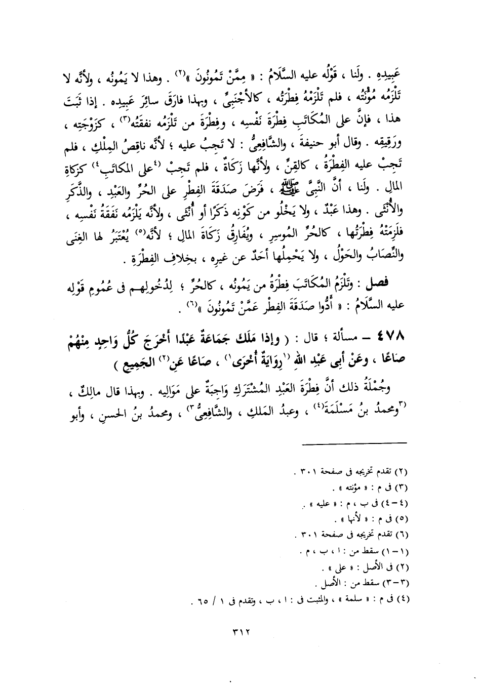 ٤٧٨ - مسألة؛ قال: (وإذا مَلَكَ جَمَاعَةٌ عَبْدًا أخْرَجَ كُلُّ وَاحِدٍ مِنْهُمْ صَاعًا، وعَنْ أبِى عَبْدِ اللهِ [رِوَايَةٌ أُخْرَى] (١)، صَاعًا عَنِ (٢) الجَمِيعِ)