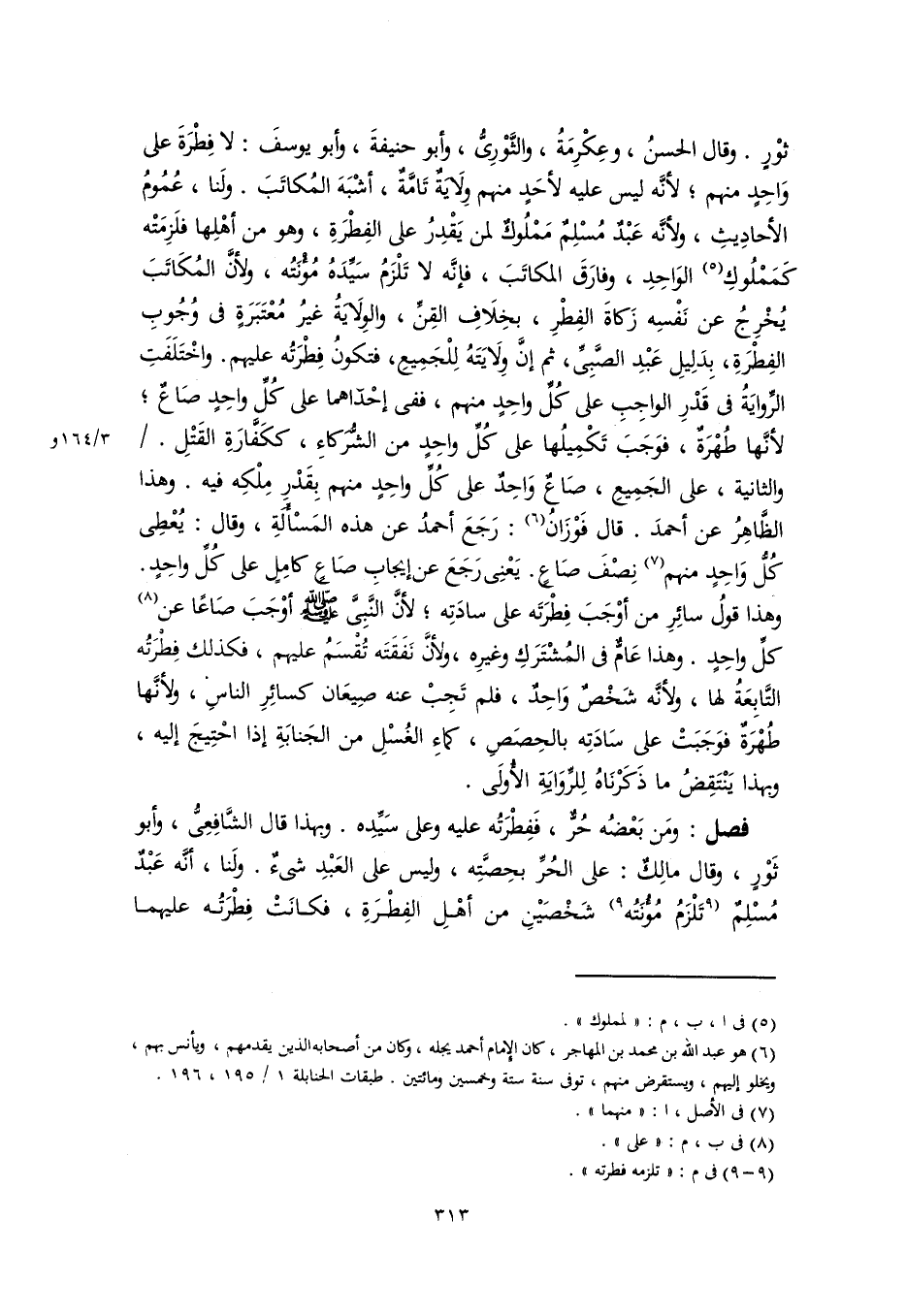 ثوْرٍ. وقال الحسنُ، وعِكْرِمَةُ، والثَّوْرِىُّ، وأبو حنيفةَ، وأبو يوسفَ: لا فِطْرَةَ على وَاحِدٍ منهم؛ لأنَّه ليس عليه لأحَدٍ منهم وِلَايَةٌ تَامَّةٌ، أشْبَهَ المُكاتَبَ. ولَنا، عُمُومُ الأحادِيثِ، ولأنَّه عَبْدٌ مُسْلِمٌ مَمْلُوكٌ لمن يَقْدِرُ على الفِطْرَةِ، وهو من أهْلِها فلَزِمَتْه كَمَمْلُوكِ (٥) الوَاحِدِ، وفارَقَ المكاتَبَ، فإنَّه لا تَلْزَمُ سَيِّدَهُ مُؤْنَتُه، ولأنَّ المُكَاتَبَ يُخْرِجُ عن نَفْسِه زَكاةَ الفِطْرِ، بخِلَافِ القِنِّ، والوِلَايَةُ غيرُ مُعْتَبَرَةٍ فى وُجُوبِ الفِطْرَةِ، بِدَلِيلِ عَبْدِ الصَّبِىِّ، ثم إنَّ وِلَايَتَهُ لِلْجَمِيعِ، فتكونُ فِطْرَتُه عليهم. واخْتَلَفَتِ الرِّوايَةُ فى قَدْرِ الواجِبِ على كُلِّ واحِدٍ منهم، ففى إحْداهما على كُلِّ واحِدٍ صَاعٌ؛ لأنَّها طُهْرَةٌ، فوَجَبَ تَكْمِيلُها على كُلِّ واحِدٍ من الشُّرَكاءِ، ككَفَّارَةِ القَتْلِ. والثانية، على الجَمِيعِ، صَاعٌ وَاحِدٌ على كُلِّ واحِدٍ منهم بِقَدْرِ مِلْكِه فيه. وهذا الظَّاهِرُ عن أحمدَ. قال فَوْزَانُ (٦): رَجَعَ أحمدُ عن هذه المَسْألَةِ، وقال: يُعْطِى كُلُّ وَاحِدٍ منهم (٧) نِصْفَ صَاعٍ. يَعْنِى رَجَعَ عن إيجابِ صَاعٍ كامِلٍ على كُلِّ واحِدٍ. وهذا قولُ سائِرِ من أوْجَبَ فِطْرَتَه على سادَتِه؛ لأنَّ النَّبِىَّ -صَلَّى اللهُ عَلَيْهِ وَسَلَّمَ- أوْجَبَ صَاعًا عن (٨) كلِّ واحِدٍ. وهذا عَامٌّ فى المُشْتَرَكِ وغيرِه، ولأنَّ نَفَقَتَه تُقسَمُ عليهم، فكذلك فِطْرَتُه التَّابِعَةُ لها، ولأنَّه شَخْصٌ وَاحِدٌ، فلم تَجِبْ عنه صِيعَان كسائِرِ الناسِ، ولأنَّها طُهْرَةٌ فوَجَبَتْ على سَادَتِه بالحِصَصِ، كماءِ الغُسْلِ من الجَنابَةِ إذا احْتِيجَ إليه، وبهذا يَنْتَقِضُ ما ذَكَرْنَاهُ لِلرِّوَايَةِ الأُولَى.