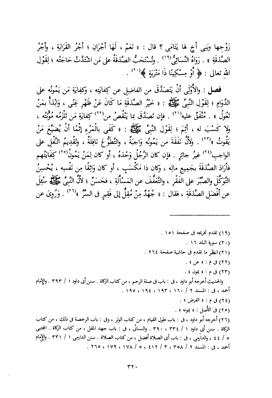 زَوْجِها وبَنِى أخٍ لها يَتَامَى؟ قال: "نَعَمْ، لَهَا أجْرَانِ؛ أجْرُ القَرَابَةِ، وأجْرُ الصَّدَقَةِ". رَوَاهُ النَّسَائِىُّ (١٩). وتُسْتَحَبُّ الصَّدَقَةُ على مَن اشْتَدَّتْ حَاجَتُه؛ لِقَوْلِ اللهِ تعالى: {أَوْ مِسْكِينًا ذَا مَتْرَبَةٍ} (٢٠).