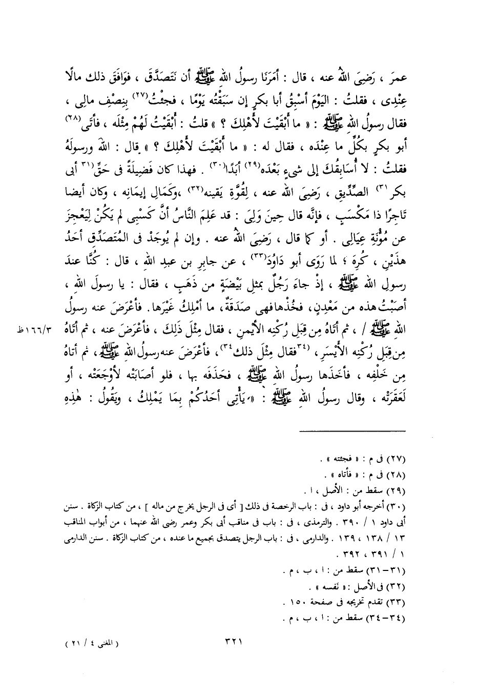 عمرَ، رَضِىَ اللهُ عنه، قال: أمَرَنَا رسولُ اللهِ -صَلَّى اللهُ عَلَيْهِ وَسَلَّمَ- أن نَتَصَدَّقَ، فوَافَقَ ذلك مالًا عِنْدِى، فقلتُ: اليَوْمَ أسْبِقُ أبا بكرٍ إن سَبَقْتُه يَوْمًا، فجئْتُ (٢٧) بِنِصْفِ مالِى، فقال رسولُ اللهِ -صَلَّى اللهُ عَلَيْهِ وَسَلَّمَ-: "ما أبْقَيْتَ لأَهْلِكَ؟ " قلتُ: أَبْقَيْتُ لَهُمْ مِثْلَه، فأتَى (٢٨) أبو بكرٍ بكُلِّ ما عِنْدَه، فقال له: "ما أَبْقَيْتَ لأَهْلِكَ؟ " قال: اللَّه ورسولَهُ فقلتُ: لا أُسَابِقُكَ إلى شىءٍ بَعْدَه (٢٩) أبَدًا (٣٠). فهذا كان فَضِيلَةً في حَقِّ [أبى بكر] (٣١) الصِّدِّيقِ، رَضِىَ اللَّه عنه، لِقُوَّةِ يَقينه (٣٢)، وكَمَالِ إيمَانِه، وكان أيضا تَاجِرًا ذا مَكْسَبٍ، فإنَّه قال حِينَ وَلِىَ: قد عَلِمَ النَّاسُ أنَّ كَسْبِى لم يَكُنْ لِيَعْجِزَ عن مُؤْنَةِ عِيَالِى. أو كما قال، رَضِىَ اللهُ عنه. وإن لم يُوجَدْ في المُتَصَدِّقِ أحَدُ هذَيْنِ، كُرِهَ؛ لما رَوَى أبو دَاوُدَ (٣٣)، عن جابِرِ بن عبدِ اللهِ، قال: كُنَّا عندَ رسولِ اللَّه -صَلَّى اللهُ عَلَيْهِ وَسَلَّمَ-، إذْ جاءَ رَجُلٌ بمثلِ بَيْضَةٍ من ذَهَبٍ، فقال: يا رسولَ اللهِ، أصَبْتُ هذه من مَعْدِنٍ، فخُذْها فهى صَدَقَةٌ، ما أمْلِكُ غَيْرَها. فأعْرَضَ عنه رسولُ اللهِ -صَلَّى اللهُ عَلَيْهِ وَسَلَّمَ-، ثم أتَاهُ مِن قِبَلِ رُكْنِه الأيْمنِ، فقال مِثْلَ ذَلِكَ، فأعْرَضَ عنه، ثم أتَاهُ مِن قِبَلِ رُكْنِه الأَيْسَرِ، [فقال مِثْلَ ذلك] (٣٤)، فأعْرَضَ عنه رسولُ اللهِ -صَلَّى اللهُ عَلَيْهِ وَسَلَّمَ-، ثم أتاهُ مِن خَلْفِه، فأخَذَها رسولُ اللهِ -صَلَّى اللهُ عَلَيْهِ وَسَلَّمَ-، فحَذَفَه بها، فلو أصَابَتْه لأوْجَعَتْه، أو لَعَقَرَتْه، وقال رسولُ اللهِ -صَلَّى اللهُ عَلَيْهِ وَسَلَّمَ-: "يَأْتِى أحَدُكُمْ بِمَا يَمْلِكُ، ويَقُولُ: هذِهِ