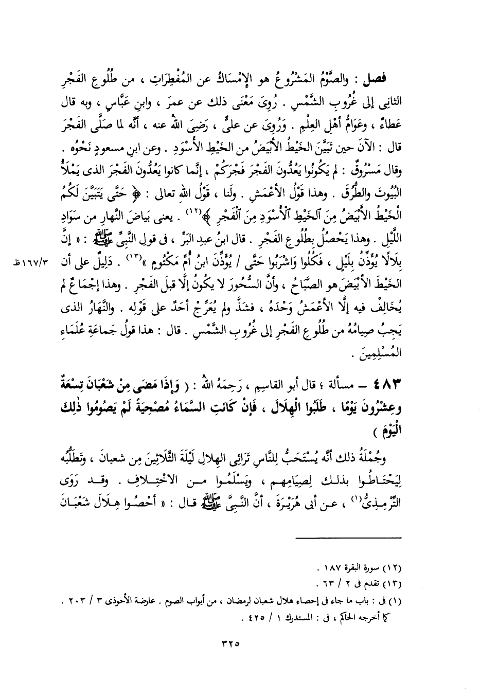 فصل: والصَّوْمُ المَشْرُوعُ هو الإِمْسَاكُ عن المُفْطِرَاتِ، من طُلُوعِ الفَجْرِ الثانِى إلى غُرُوبِ الشَّمْسِ. رُوِىَ مَعْنَى ذلك عن عمرَ، وابنِ عَبَّاسٍ، وبه قال عَطاءٌ، وعَوَامُّ أهْلِ العِلْمِ. وَرُوِىَ عن علىٍّ، رَضِىَ اللهُ عنه، أنَّه لما صَلَّى الفَجْرَ قال: الآنَ حين تَبَيَّنَ الخَيْطُ الأبْيَضُ من الخَيْطِ الأَسْوَدِ. وعن ابنِ مسعودٍ نَحْوُه. وقال مَسْرُوقٌ: لم يَكُونُوا يَعُدُّونَ الفَجْرَ فَجْرَكُمْ، إنَّما كانوا يَعُدُّونَ الفَجْرَ الذى يَمْلَأُ البُيُوتَ والطُّرُقَ. وهذا قَوْلُ الأعْمَشِ. ولَنا، قَوْلُ اللهِ تعالى: {حَتَّى يَتَبَيَّنَ لَكُمُ الْخَيْطُ الْأَبْيَضُ مِنَ الْخَيْطِ الْأَسْوَدِ مِنَ الْفَجْرِ} (١٢). يعنى بَياضَ النَّهارِ من سَوَادِ اللَّيْلِ. وهذا يَحْصُلُ بِطُلُوعِ الفَجْرِ. قال ابنُ عبدِ البَرِّ، في قولِ النَّبِىِّ -صَلَّى اللهُ عَلَيْهِ وَسَلَّمَ-: "إنَّ بِلَالًا يُؤَذِّنُ بِلَيْلٍ، فَكُلُوا وَاشْرَبُوا حَتَّى يُؤَذِّنَ ابنُ أُمِّ مَكْتُومٍ" (١٣). دَلِيلٌ على أن الخَيْطَ الأبْيَضَ هو الصَّبَاحُ، وأنَّ السُّحُورَ لا يكُونُ إلَّا قبلَ الفَجْرِ. وهذا إجْمَاعٌ لم يُخَالِفْ فيه إلَّا الأعْمَشُ وَحْدَهُ، فشَذَّ ولم يُعَرِّجْ أحَدٌ على قَوْلِه. والنَّهَارُ الذى يَجِبُ صِيامُهُ من طُلُوعِ الفَجْرِ إلى غُرُوبِ الشَّمْسِ. قال: هذا قولُ جَماعَةِ عُلَمَاءِ المُسْلِمِينَ.