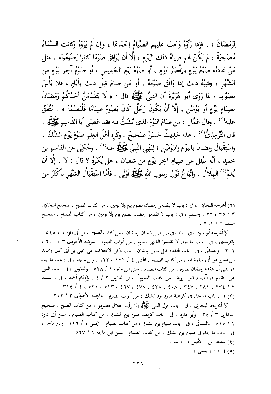 (٢) أخرجه البخاري، في: باب لا يتقدمن رمضان بصوم يوم ولا يومين، من كتاب الصوم. صحيح البخاري ٣/ ٣٥، ٣٦. ومسلم، في: باب لا تقدموا رمضان بصوم يوم ولا يومين، من كتاب الصيام. صحيح مسلم ٢/ ٧٦٢.