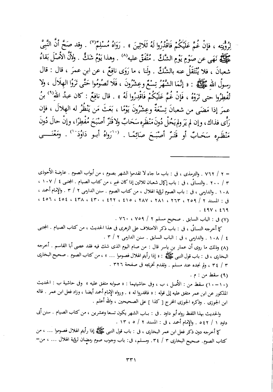 (١٠) سقط من: الأصل، ب، وفى حاشيتهما: "صوابه متفق عليه" وفى حاشية ب: الحديث المذكور عن ابن عمر متفق عليه إلى قوله: "فاقدروا له". ورواه الإمام أحمد أيضا، وزاد فعل ابن عمر. قاله ابن الجوزى. وذكره الجوزى المخرج [كذا] على الصحيحين، واللَّه أعلم.