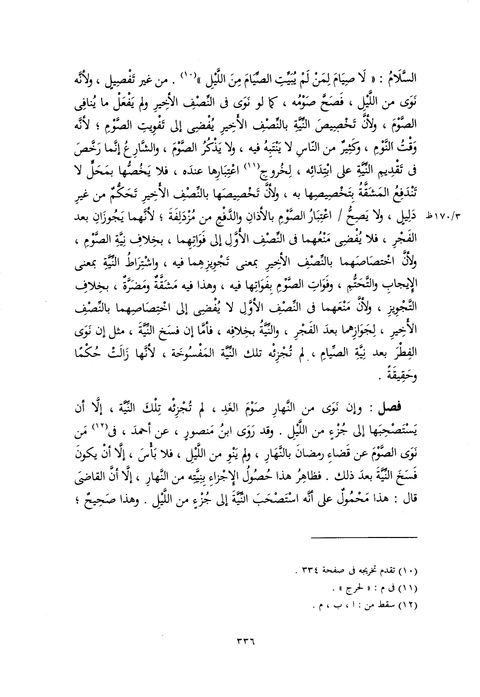 فصل: وإن نَوَى من النَّهارِ صَوْمَ الغَدِ، لم تُجْزِئْه تِلْكَ النِّيَّة، إلَّا أن يَسْتَصْحِبَها إلى جُزْءٍ من اللَّيْلِ. وقد رَوَى ابنُ مَنصورٍ، عن أحمدَ، في (١٢) مَن نَوَى الصَّوْمَ عن قَضاءِ رمضانَ بالنَّهَارِ، ولم يَنْوِ من اللَّيْلِ، فلا بَأْسَ، إلَّا أنْ يكونَ فَسَخَ النِّيَّةَ بعدَ ذلك. فظاهِرُ هذا حُصُولُ الإِجْزاءِ بِنِيَّتِه من النَّهارِ، إلَّا أنَّ القاضىَ قال: هذا مَحْمُولٌ على أنَّه اسْتَصْحَبَ النِّيَّةَ إلى جُزْءٍ من اللَّيْلِ. وهذا صَحِيحٌ؛