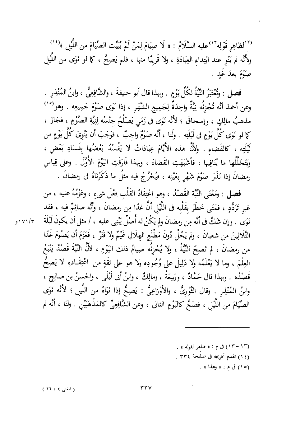 فصل: ومَعْنَى النِّيَّة القَصْدُ، وهو اعْتِقَادُ القَلْبِ فِعْلَ شىءٍ، وعَزْمُهُ عليه، من غيرِ تَرَدُّدٍ، فمَتَى خَطَرَ بِقَلْبِه في اللَّيْلِ أنَّ غدًا مِن رمضانَ، وأنَّه صائِمٌ فيه، فقد نَوَى. وإن شَكَّ في أنَّه مِن رمضانَ ولم يَكُنْ له أَصْلٌ يَبْنِى عليه، مثل أن يكونَ لَيْلَةَ الثَّلَاثِينَ من شعبانَ، ولم يَحُلْ دُونَ مَطْلَعِ الهِلَالِ غَيْمٌ ولا قَتَرٌ، فَعَزَمَ أن يَصُومَ غَدًا من رمضانَ، لم تَصِحّ النِّيَّةُ، ولا يُجْزِئُه صِيامُ ذلك اليَوْمِ، لأنَّ النِّيَّةَ قَصْدٌ يَتْبَعُ العِلْمَ، وما لا يَعْلَمُه ولا دَلِيلَ على وُجُودِه ولا هو على ثقَةٍ من اعْتِقَادهِ لا يَصِحُّ قَصْدُه. وبهذا قال حَمَّادٌ، ورَبيعَةُ، ومالِكٌ، وابنُ أبى لَيْلَى، والحسنُ بن صالِحٍ، وابنُ المُنْذِرِ. وقال الثَّوْرِىُّ، والأوْزاعِىُّ: يَصِحُّ إذا نَوَاهُ من اللَّيلِ؛ لأنَّه نَوَى الصِّيَامَ من اللَّيْلِ، فصَحَّ كاليَوْمِ الثانى، وعن الشَّافِعِيِّ كالمَذْهَبَيْنِ. ولنَا، أنَّه لم