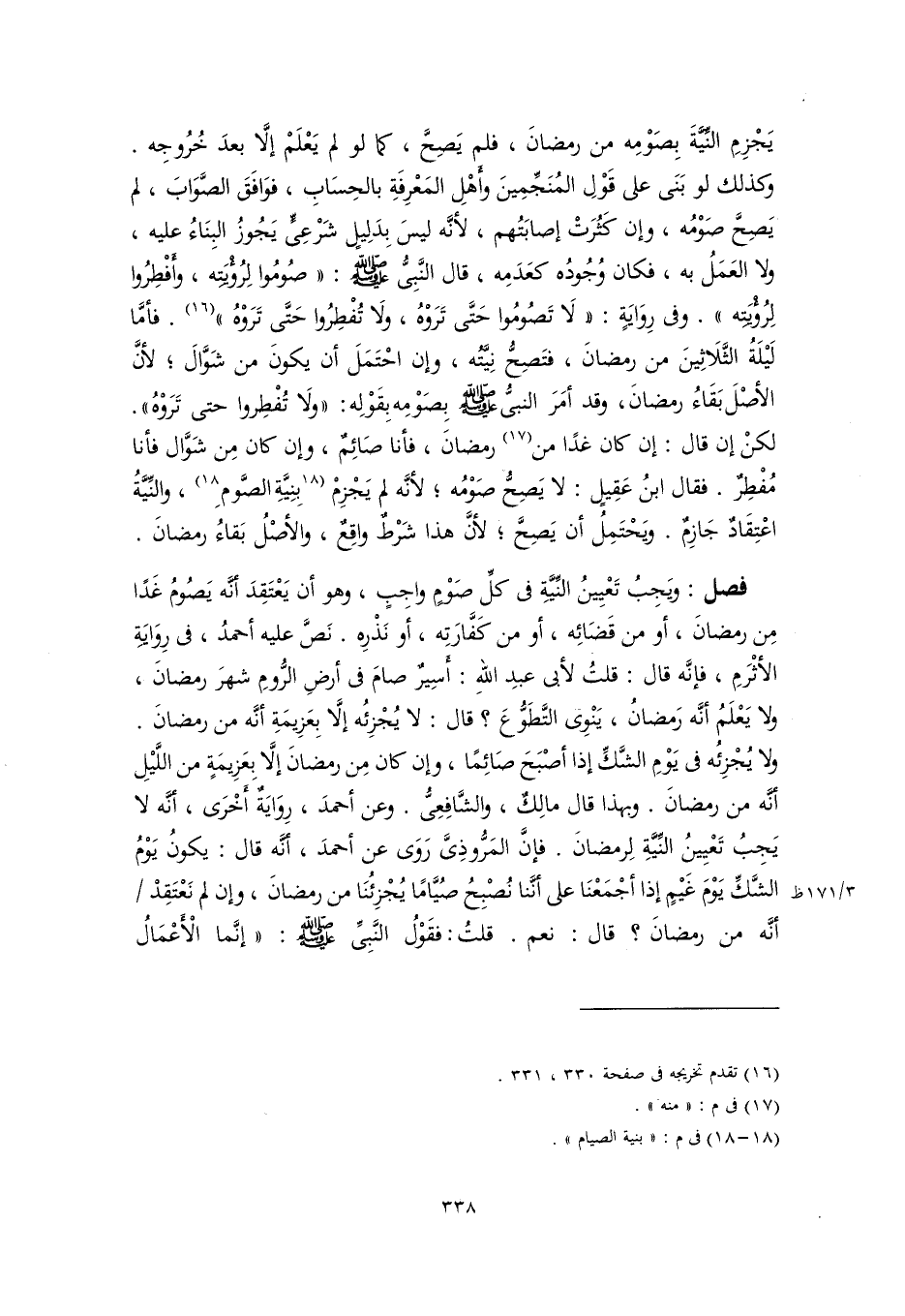 يَجْزِمِ النِّيَّةَ بِصَوْمِه من رمضانَ، فلم يَصِحَّ، كما لو لم يَعْلَمْ إلَّا بعدَ خُرُوجِه. وكذلك لو بَنَى على قَوْلِ المُنَجِّمِينَ وأَهْلِ المَعْرِفَةِ بالحِسَابِ، فوَافَقَ الصَّوَابَ، لم يَصِحَّ صَوْمُه، وإن كَثُرَتْ إصابَتُهم، لأنَّه ليسَ بِدَلِيلٍ شَرْعِيٍّ يَجُوزُ البِنَاءُ عليه، ولا العَمَلُ به، فكان وُجُودُه كعَدَمِه، قال النَّبِىُّ -صَلَّى اللهُ عَلَيْهِ وَسَلَّمَ-: "صُومُوا لِرُؤْيَتِه، وأَفْطِرُوا لِرُؤْيَتِه". وفي رِوَايَةٍ: "لَا تَصُومُوا حَتَّى تَرَوْهُ، ولَا تُفْطِرُوا حَتَّى تَرَوْهُ" (١٦). فأمَّا لَيْلَةُ الثَّلَاثِينَ من رمضانَ، فتَصِحُّ نِيَّتُه، وإن احْتَمَلَ أن يكونَ من شَوَّالَ؛ لأنَّ الأصْلَ بَقَاءُ رمضانَ، وقد أمَرَ النبيُّ -صَلَّى اللهُ عَلَيْهِ وَسَلَّمَ- بِصَوْمِه بِقَوْلِه: "ولَا تُفْطِروا حتى تَرَوْهُ". لكنْ إن قال: إن كان غدًا من (١٧) رمضانَ، فأنا صَائِمٌ، وإن كان مِن شَوَّال فأنا مُفْطِرٌ. فقال ابنُ عَقِيلٍ: لا يَصِحُّ صَوْمُه؛ لأنَّه لم يَجْزِمْ [بِنِيَّةِ الصَّومِ] (١٨)، والنِّيَّةُ اعْتِقَادٌ جَازِمٌ. ويَحْتَمِلُ أن يَصِحَّ؛ لأنَّ هذا شَرْطٌ واقِعٌ، والأصْلُ بَقاءُ رمضانَ.