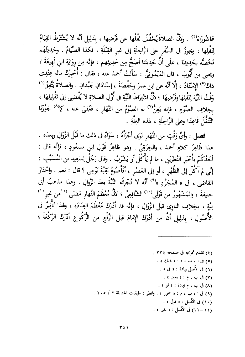 عَاشُورَاءَ (٤). ولأنَّ الصلاةَ يُخَفَّفُ نَفْلُها عن فَرْضِها، بِدَلِيلِ أنَّه لا يُشْتَرَطُ القِيَامُ لِنَفْلِها، ويجوزُ في السَّفَرِ على الرَّاحِلَةِ إلى غيرِ القِبْلَةِ، فكذا الصِّيَامُ. وحَدِيثُهُم نَخُصُّه بحَدِيثِنَا، علَى أنَّ حَدِيثَنا أصَحُّ مِن حَدِيثِهم، فإنَّه مِن رِوَايَةِ ابنِ لَهِيعَةَ، ويحيى بن أَيُّوبَ، قال المَيْمُونِىُّ: سَألتُ أحمدَ عنه، فقال: أُخْبِرُكَ ماله عِنْدِى ذاكَ (٥) الإِسْنَادُ، إلَّا أنَّه عن ابن عمرَ وحَفْصَةَ، إسْنَادَانِ جَيِّدَانِ. والصلاةُ يَتَّفِقُ (٦) وَقْتُ النِّيَّةِ لِنَفْلِهَا وفَرْضِهَا؛ لأنَّ اشْتِرَاطَ النِّيَّةِ في أَوَّلِ الصلاةِ لا يُفْضِى إلى تَقْلِيلِهَا، بِخِلافِ الصَّوْمِ، فإنه يَعِنُّ (٧) له الصَّوْمُ من النَّهَارِ، فعُفِىَ عنه، كما (٨) جَوَّزْنَا التَّنَفُّلَ قَاعِدًا وعلى الرَّاحِلَةِ، لهذه العِلَّةِ.