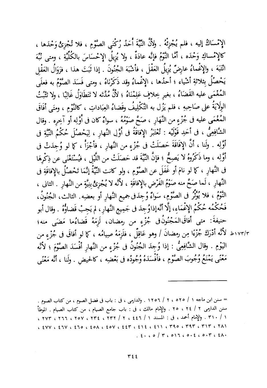 الإِمْسَاكُ إليه، فلم يُجْزِئْهُ. ولأنَّ النِّيَّةَ أَحَدُ رُكْنَىِ الصَّوْمِ، فلا تُجْزِئُ وَحْدَها، كالإِمْساكِ وَحْدَه، أمَّا النَّوْمُ فإنَّه عادَةٌ، ولا يُزِيلُ الإِحْسَاسَ بالكُلِّيَّةِ، ومتى نُبِّهَ انْتَبَهَ، والإِغْماءُ عارِضٌ يُزِيلُ العَقْلَ، فأشْبَهَ الجُنُونَ. إذا ثَبَتَ هذا، فزَوَالُ العَقْلِ يَحْصُلُ بِثلاثةِ أشْياء؛ أحدُها، الإِغْماءُ وقد ذَكَرْنَاهُ، ومتى فَسَدَ الصَّوْمُ به فعلَى المُغْمَى عليه القَضَاءُ، بغيرِ خِلافٍ عَلِمْنَاهُ؛ لأنَّ مُدَّتَه لا تَتَطَاوَلُ غَالِبًا، ولا تَثْبُتُ الوِلَايَةُ على صَاحِبهِ، فلم يَزُل به التَّكْلِيفُ وقَضاءُ العِبَاداتِ، كالنَّوْمِ، ومتَى أفَاقَ المُغْمَى عليه في جُزْءٍ من النَّهَارِ، صَحَّ صَوْمُهُ، سواءٌ كان في أَوَّلِه أو آخِرِه. وقال الشَّافِعِىُّ، في أحَدِ قَوْلَيْه: تُعْتَبَرُ الإِفاقَةُ في أَوَّلِ النَّهارِ، لِيَحْصُلَ حُكْمُ النِّيَّة في أوَّلِه. ولَنا، أنَّ الإِفَاقَةَ حَصَلَتْ في جُزْءٍ من النَّهارِ، فأجْزَأَ، كما لو وُجِدَتْ في أوَّلِه، وما ذَكَرُوهُ لا يَصِحُّ؛ فإنَّ النِّيَّةَ قد حَصَلَتْ من اللَّيْلِ، فيُسْتَغْنَى عن ذِكْرِهَا في النَّهارِ، كما لو نامَ أو غَفَلَ عن الصَّوْمِ، ولو كانت النِّيَّةُ إنَّمَا تَحْصُلُ بالإِفاقَةِ في النَّهارِ، لَما صَحَّ منه صَوْمُ الفَرْضِ بالإِفاقَةِ، لأنَّه لا يُجْزِئُ بِنِيَّةٍ من النَّهارِ. الثاني، النَّوْمُ، فلا يُؤَثِّرُ في الصَّوْمِ، سَواءٌ وُجِدَ في جميع النَّهارِ أو بعضِه. الثالث، الجُنُونُ، فَحُكْمُه حُكْمُ الإِغْمَاءِ، إلَّا أنَّه إذا وُجِدَ في جَمِيعِ النَّهارِ، لم يَجِبْ قَضاؤُهُ. وقال أبو حنيفةَ: متى أفاقَ المَجْنُونُ في جُزْءٍ من رمضان، لَزِمَهُ قَضاءُ ما مَضَى منه؛ لأنَّه أدْرَكَ جُزْءًا مِن رمضانَ وهو عَاقِلٌ، فلَزِمَهُ صِيامُه، كما لو أفاقَ في جُزْءٍ من اليَوْمِ. وقال الشَّافِعِيُّ: إذا وُجِدَ الجُنُونُ في جُزْءٍ من النَّهارِ أفْسَدَ الصَّوْمَ؛ لأنَّه مَعْنًى يَمْنَعُ وُجُوبَ الصَّوْمِ، فأفْسَدَهُ وُجُودُه في بَعْضِه، كالحيضِ. ولَنا، أنَّه مَعْنًى