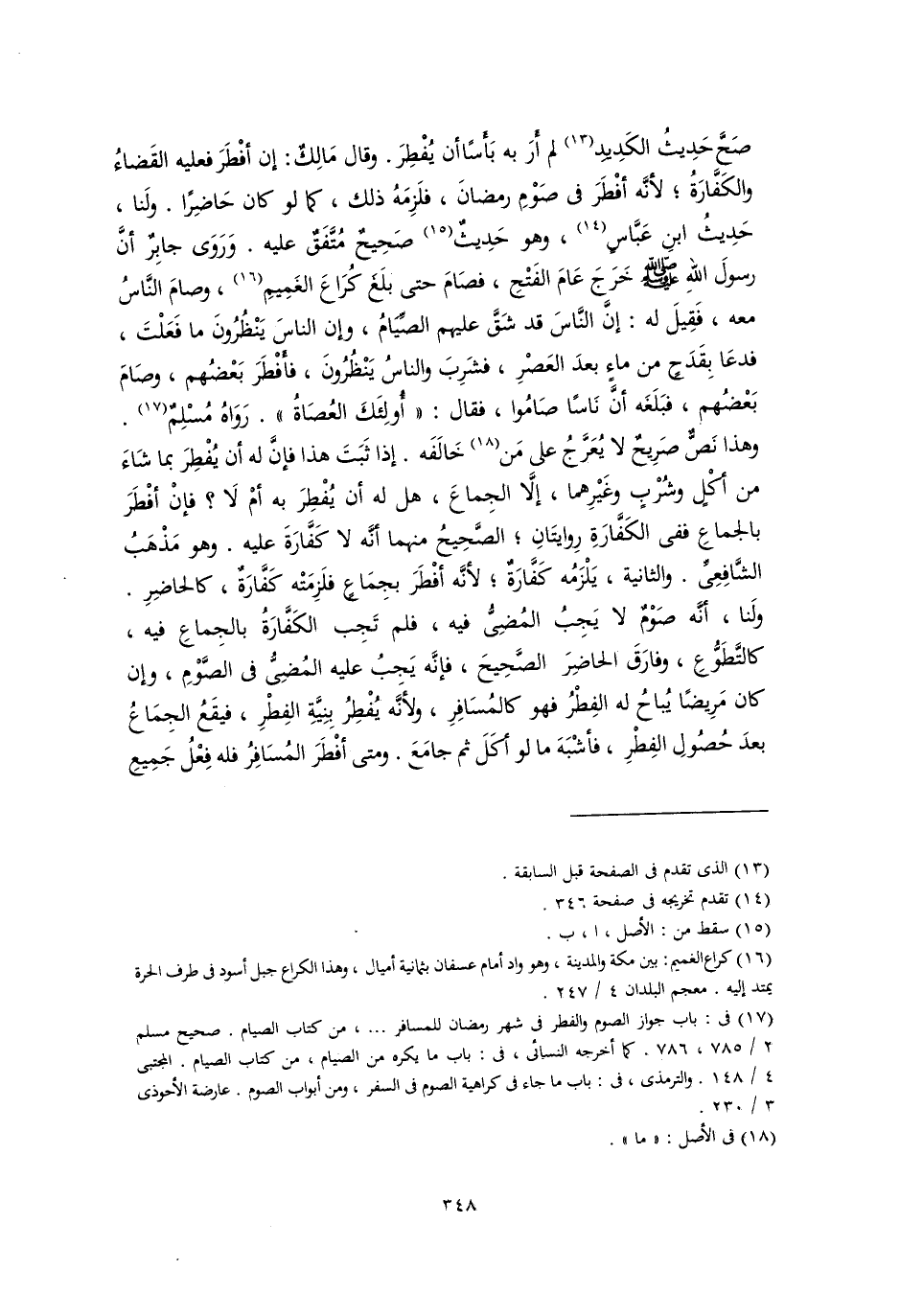 صَحَّ حَدِيثُ الكَدِيد (١٣) لم أَرَ به بَأْسًا أن يُفْطِرَ. وقال مَالِكٌ: إن أفْطَرَ فعليه القَضاءُ والكَفَّارَةُ؛ لأنَّه أفْطَرَ في صَوْمِ رمضانَ، فلَزِمَهُ ذلك، كما لو كان حَاضِرًا. ولَنا، حَدِيثُ ابنِ عَبَّاسٍ (١٤)، وهو حَدِيثٌ (١٥) صَحِيحٌ مُتَّفَقٌ عليه. وَرَوَى جابِرٌ أنَّ رسولَ اللهِ -صَلَّى اللهُ عَلَيْهِ وَسَلَّمَ- خَرَجَ عَامَ الفَتْحِ، فصَامَ حتى بلَغَ كُرَاعَ الغَمِيمِ (١٦)، وصامَ النَّاسُ معه، فَقِيلَ له: إنَّ النَّاسَ قد شَقَّ عليهم الصِّيَامُ، وإن الناسَ يَنْظُرُونَ ما فَعَلْتَ، فدعَا بِقَدَحٍ من ماءٍ بعدَ العَصْرِ، فشَرِبَ والناسُ يَنْظُرُونَ، فأَفْطَرَ بَعْضُهم، وصَامَ بَعْضُهم، فبَلَغَه أنَّ نَاسًا صَامُوا، فقال: "أُولَئِكَ العُصَاةُ". رَوَاهُ مُسْلِمٌ (١٧). وهذا نَصٌّ صَرِيحٌ لا يُعَرَّجُ على مَن (١٨) خَالَفَه. إذا ثَبَتَ هذا فإنَّ له أن يُفْطِرَ بما شَاءَ من أكْلٍ وشُرْبٍ وغَيْرِهما، إلَّا الجِماعَ، هل له أن يُفْطِرَ به أمْ لَا؟ فإنْ أفْطَرَ بالجماعِ ففى الكَفَّارَةِ رِوايتَانِ؛ الصَّحِيحُ منهما أنَّه لا كَفَّارَةَ عليه. وهو مَذْهَبُ الشَّافِعِىِّ. والثانية، يَلْزَمُه كَفَّارَةٌ؛ لأنَّه أفْطَرَ بجِمَاعٍ فلَزِمَتْه كَفَّارَةٌ، كالحاضِرِ. ولَنا، أنَّه صَوْمٌ لا يَجِبُ المُضِىُّ فيه، فلم تَجِب الكَفَّارَةُ بالجِماعِ فيه، كالتَّطَوُّعِ، وفارَقَ الحاضِرَ الصَّحِيحَ، فإنَّه يَجِبُ عليه المُضِىُّ في الصَّوْمِ، وإن كان مَرِيضًا يُباحُ له الفِطْرُ فهو كالمُسَافِرِ، ولأنَّه يُفْطِرُ بِنِيَّةِ الفِطْرِ، فيقَعُ الجِمَاعُ بعدَ حُصُولِ الفِطْرِ، فأشْبَهَ ما لو أكَلَ ثم جامَعَ. ومتى أفْطَرَ المُسَافِرُ فله فِعْلُ جَمِيعِ