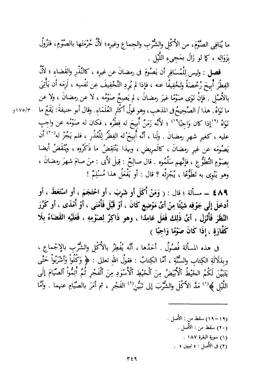 في هذه المسألة فُصُولٌ. أحَدُها، أنَّه يُفْطِرُ بالأَكْلِ والشُّرْبِ بالإِجْماعِ، وبِدَلَالَةِ الكِتابِ والسُّنَّةِ، أمَّا الكِتابُ: فقولُ اللهِ تعالى: {وَكُلُوا وَاشْرَبُوا حَتَّى يَتَبَيَّنَ لَكُمُ الْخَيْطُ الْأَبْيَضُ مِنَ الْخَيْطِ الْأَسْوَدِ مِنَ الْفَجْرِ ثُمَّ أَتِمُّوا الصِّيَامَ إِلَى اللَّيْلِ} (١) مَدَّ الأكْلَ والشُّرْبَ إلى تَبَيُّنِ (٢) الفَجْرِ، ثم أمَرَ بالصِّيَامِ عنهما. وأمَّا