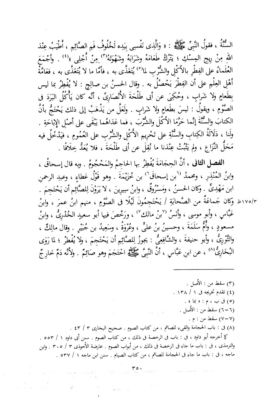 الفصل الثاني، أنَّ الحِجَامَةَ يُفْطِرُ بها الحاجِمُ والمَحْجُومُ. وبه قال إسحاقُ، وابنُ المُنْذِرِ، ومحمدُ [بن إسحاقَ] (٦) بن خُزَيْمَةَ. وهو قَوْلُ عَطاءٍ، وعبدِ الرحمنِ ابن مَهْدِيٍّ. وكان الحسنُ، ومَسْرُوقٌ، وابنُ سِيرِينَ، لا يَرَوْنَ لِلصَّائِم أن يَحْتَجِمَ. وكان جَماعَةٌ من الصَّحابَةِ يَحْتَجِمُونَ لَيْلًا في الصَّوْمِ، منهم ابنُ عمرَ، وابنُ عَبَّاسٍ، وأبو موسى، وأنَسُ [بنُ مالك] (٧)، ورَخَّصَ فيها أبو سعيدٍ الخُدْرِيُّ، وابنُ مسعودٍ، وأُمُّ سَلَمَةَ، وحسينُ بنُ عليٍّ، وعُرْوَةُ، وسَعِيدُ بن جُبَيْرٍ. وقال مالِكٌ، والثَّوْرِيُّ، وأبو حنيفةَ، والشَّافِعِيُّ: يجوزُ لِلصَّائِمِ أن يَحْتَجِمَ، ولا يُفْطرُ؛ لما رَوَى البُخَارِيُّ (٨)، عن ابنِ عَبَّاسٍ، أنَّ النَّبِيَّ -صَلَّى اللهُ عَلَيْهِ وَسَلَّمَ- احْتَجَمَ وهو صَائِمٌ. ولأنَّه دَمٌ خَارِجٌ