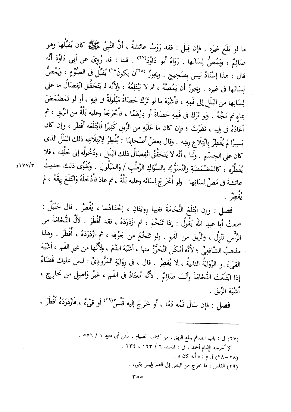 ما لو بَلَعَ غيرَه. فإن قِيلَ: فقد رَوَتْ عائشةُ، أنَّ النَّبِيَّ -صَلَّى اللهُ عَلَيْهِ وَسَلَّمَ- كان يُقَبِّلُها وهو صَائِمٌ، ويَمُصُّ لِسَانَها. رَوَاهُ أبو دَاوُدَ (٢٧). قلنا: قد رُوِىَ عن أبِى دَاوُدَ أنَّه قال: هذا إسْنَادٌ ليس بِصَحِيحٍ. ويجوزُ [أن يكونَ] (٢٨) يُقَبِّلُ في الصَّوْمِ، ويَمُصُّ لِسَانَها في غيرِه. ويجوزُ أن يَمُصَّهُ، ثم لا يَبْتَلِعُهُ، ولأنَّه لم يَتَحَقَّق انْفِصَالُ ما على لِسَانِها من البَلَلِ إلي فَمِهِ، فأشْبَهَ ما لو تَرَكَ حَصَاةً مَبْلُولَةً في فِيهِ، أو لو تَمَضْمَضَ بماءٍ ثم مَجَّهُ. ولو تَرَكَ في فَمِهِ حَصَاةً أو دِرْهَمًا، فأخْرَجَهُ وعليه بَلَّةٌ من الرِّيقِ، ثم أعَادَهُ في فِيهِ، نَظَرْتَ؛ فإن كان ما عَلَيْهِ من الرِّيقِ كَثِيرًا فَابْتَلَعَه أفْطَرَ، وإن كان يَسِيرًا لم يُفْطِرْ بِابْتِلَاعِ رِيقِه. وقال بعضُ أصْحابِنَا: يُفْطِرُ لِابْتِلَاعِه ذلك البَلَلَ الذى كان على الجِسْمِ. ولَنا، أنَّه لا يَتَحَقَّقُ انْفِصَالُ ذلك البَلَلِ، ودُخُولُه إلى حَلْقِه، فلا يُفَطِّرُه، كالمَضْمَضَةِ والتَّسَوُّكِ بالسِّوَاكِ الرَّطْبِ وَالمَبْلُولِ. ويُقَوِّى ذلك، حديثُ عائشةَ في مَصِّ لِسَانِها. ولو أَخْرَجَ لِسَانَه وعليه بَلَّةٌ، ثم عادَ فأدْخَلَهُ وَابْتلَعَ رِيقَهُ، لم يُفْطِرْ.