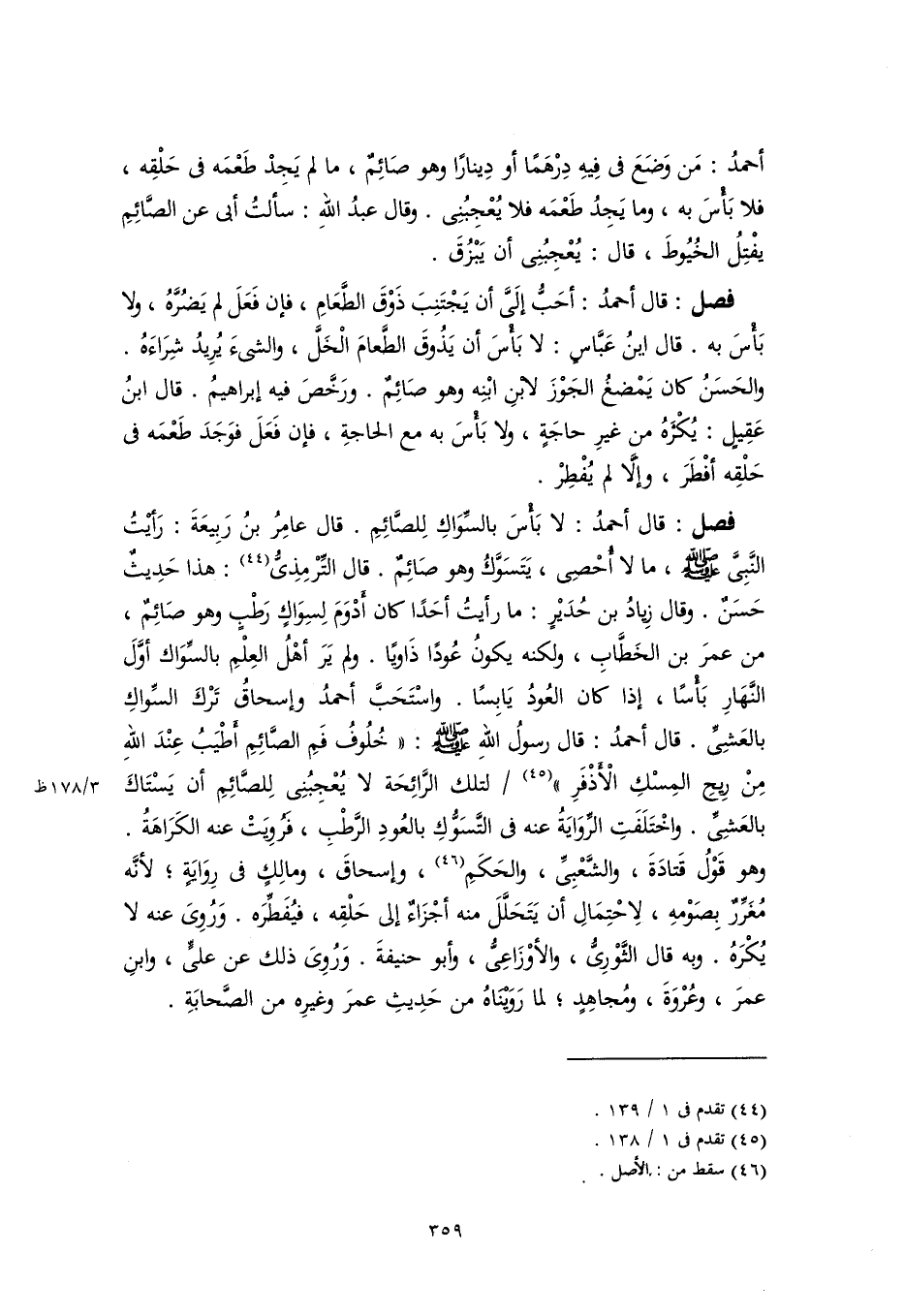 فصل: قال أحمدُ: لا بَأْسَ بالسِّوَاكِ لِلصَّائِمِ. قال عامِرُ بنُ رَبِيعَةَ: رَأَيْتُ النَّبِيَّ -صَلَّى اللهُ عَلَيْهِ وَسَلَّمَ-، ما لا أُحْصِى، يَتَسَوَّكُ وهو صَائِمٌ. قال التِّرْمِذِيُّ (٤٤): هذا حَدِيثٌ حَسَنٌ. وقال زِيادُ بن حُدَيْرٍ: ما رأيتُ أحَدًا كان أَدْوَمَ لِسِوَاكٍ رَطْبٍ وهو صَائِمٌ، من عمرَ بن الخَطَّابِ، ولكنه يكونُ عُودًا ذَاويًا. ولم يَرَ أهْلُ العِلْمِ بالسِّوَاك أوَّلَ النَّهَارِ بَأْسًا، إذا كان العُودُ يَابِسًا. واسْتَحَبَّ أحمدُ وإسحاقُ تَرْكَ السِّواكِ بالعَشِىِّ. قال أحمدُ: قال رسولُ اللهِ -صَلَّى اللهُ عَلَيْهِ وَسَلَّمَ-: "خُلُوفُ فَمِ الصَّائِمِ أطْيَبُ عِنْدَ اللهِ مِنْ رِيحِ المِسْكِ الْأذْفَرِ" (٤٥) لتلك الرَّائِحَة لا يُعْجِبُنِى لِلصَّائِمِ أن يَسْتَاكَ بالعَشِيِّ. واخْتَلَفَتِ الرِّوَايَةُ عنه في التَّسَوُّكِ بالعُودِ الرَّطْبِ، فَرُوِيَتْ عنه الكَرَاهَةُ. وهو قَوْلُ قَتادَةَ، والشَّعْبِيِّ، والحَكَمِ (٤٦)، وإسحاقَ، ومالِكٍ في رِوَايَةٍ؛ لأنَّه مُغَرِّرٌ بِصَوْمهِ، لِاحْتِمَالِ أن يَتَحَلَّلَ منه أجْزَاءٌ إلى حَلْقِه، فيُفَطِّرَه. وَرُوِىَ عنه لا يُكْرَهُ. وبه قال الثَّوْرِيُّ، والأوْزَاعِيُّ، وأبو حنيفةَ. وَرُوِىَ ذلك عن عليٍّ، وابنِ عمرَ، وعُرْوَةَ، ومُجاهِدٍ؛ لما رَوَيناهُ من حَدِيثِ عمرَ وغيرِه من الصَّحابَةِ.